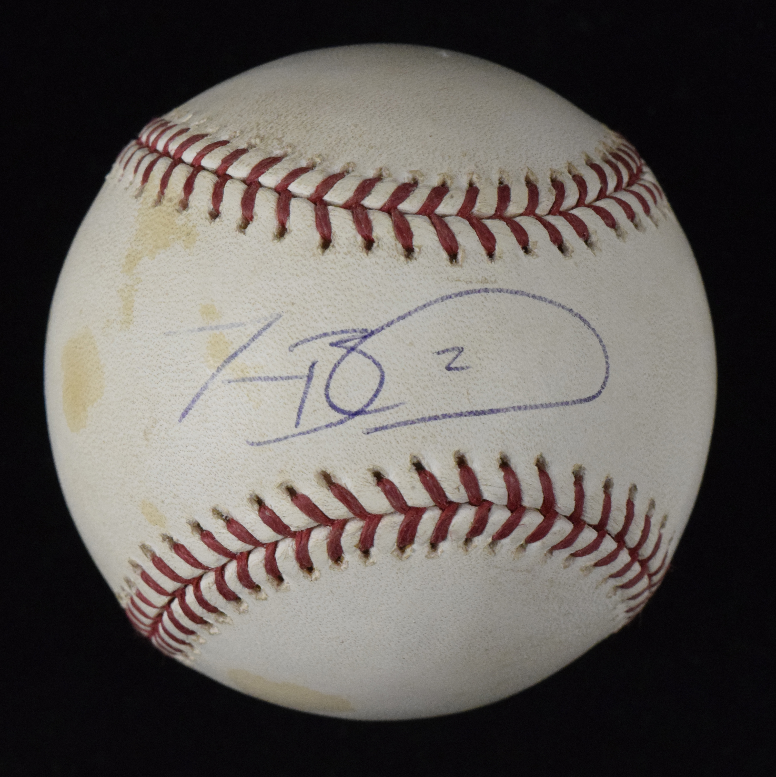 Description:Mookie Betts autographed B. Selig baseball (Sig. NM). B. Selig MLB baseball has been signed on the sweet spot by Mookie Betts, rating 7 out of 10. Baseball has several areas of toning/spottng: EX.