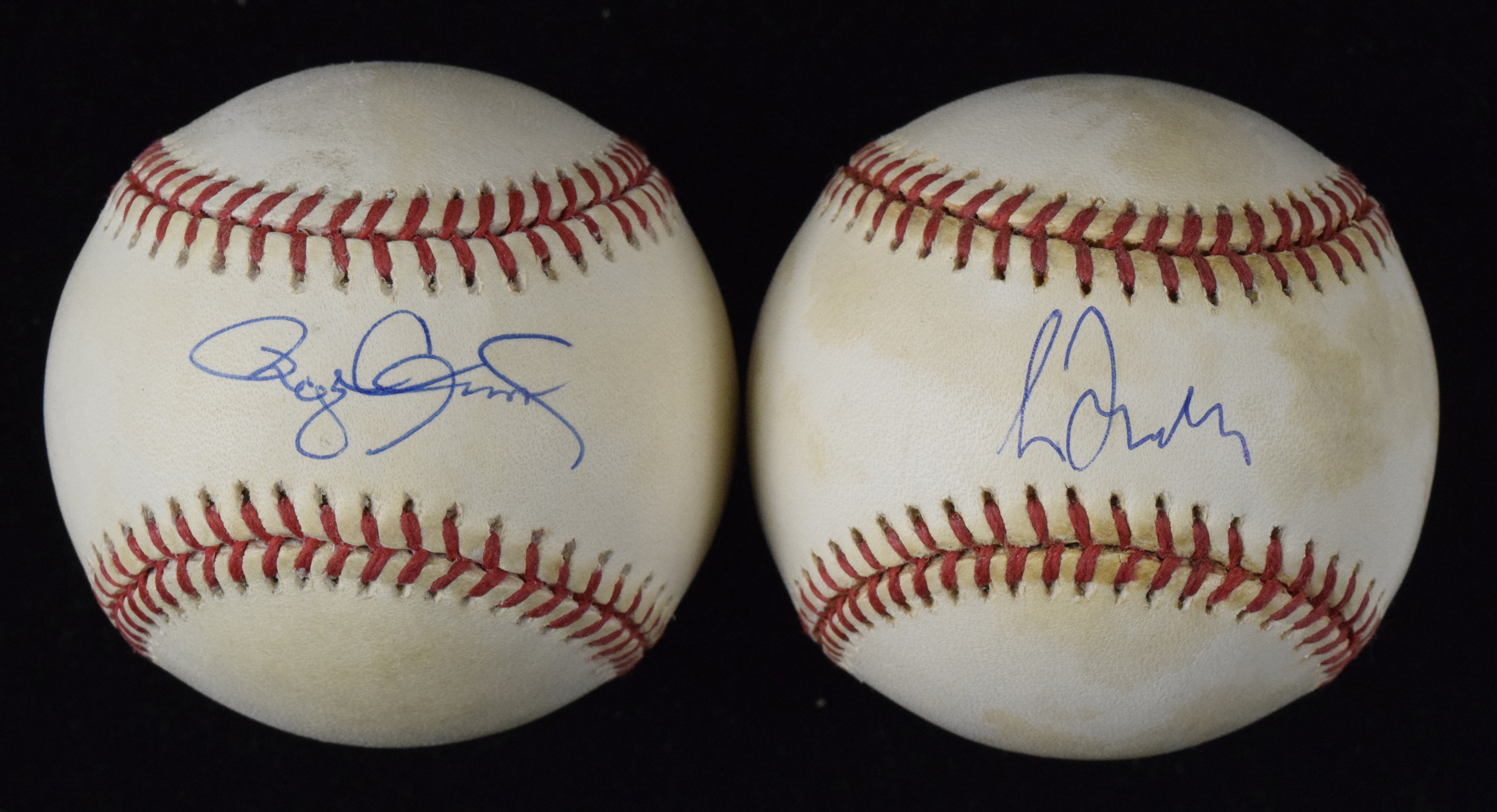 Description:Pair of Roger Clemens and Greg Maddux single-signed baseballs in attractive display case (Sigs. NM/MT). Both are signed on the sweet spot, with (1) G. Budig A.L. baseball signed by Roger Clemens and (1) L. Coleman N.L. baseball signed by Greg Maddux. Both are housed in an attractive 14"x8" lucite display case. Signatures rate 8 out of 10, and balls have moderate toning/spotting: EX.