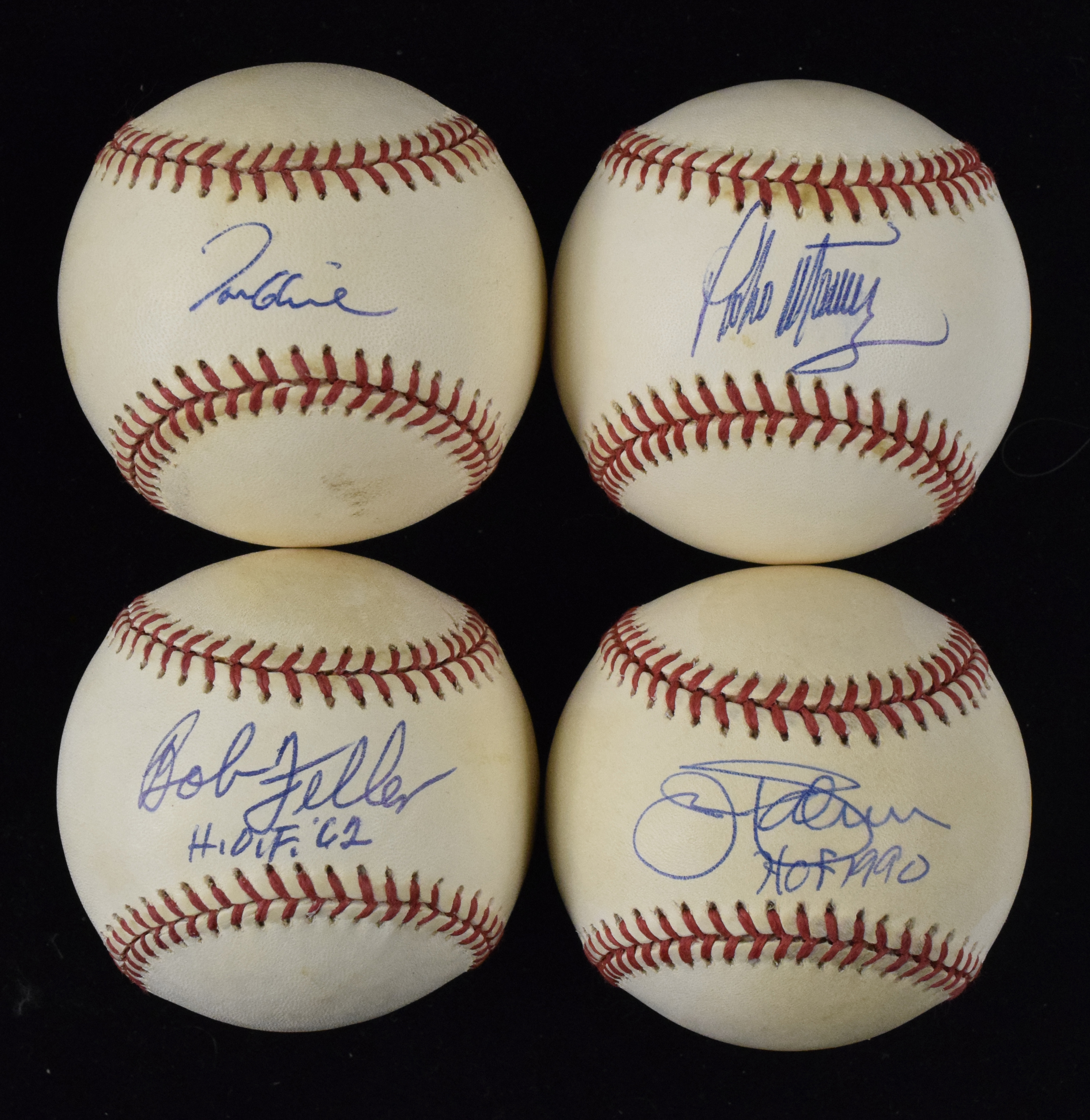 Description:Lot of (7) HOF pitcher autographed baseballs, with Glavine, Martinez and Palmer (Sigs. NM/MT-MT). Nice assortment of single-signed baseballs, each autographed by a Hall of Fame pitcher. Includes (3) on L. Coleman N.L. balls, individually signed by Robin Roberts, Fergie Jenkins and Tom Glavine; and (4) on G. Budig A.L. balls, individually signed by Pedro Martinez, Rollie Fingers, Bob Feller with "HOF 62" inscription and Jim Palmer with "HOF 1990" inscription. Signatures rate 8/9 out of 10, and balls have light to moderate toning: EX-NM.