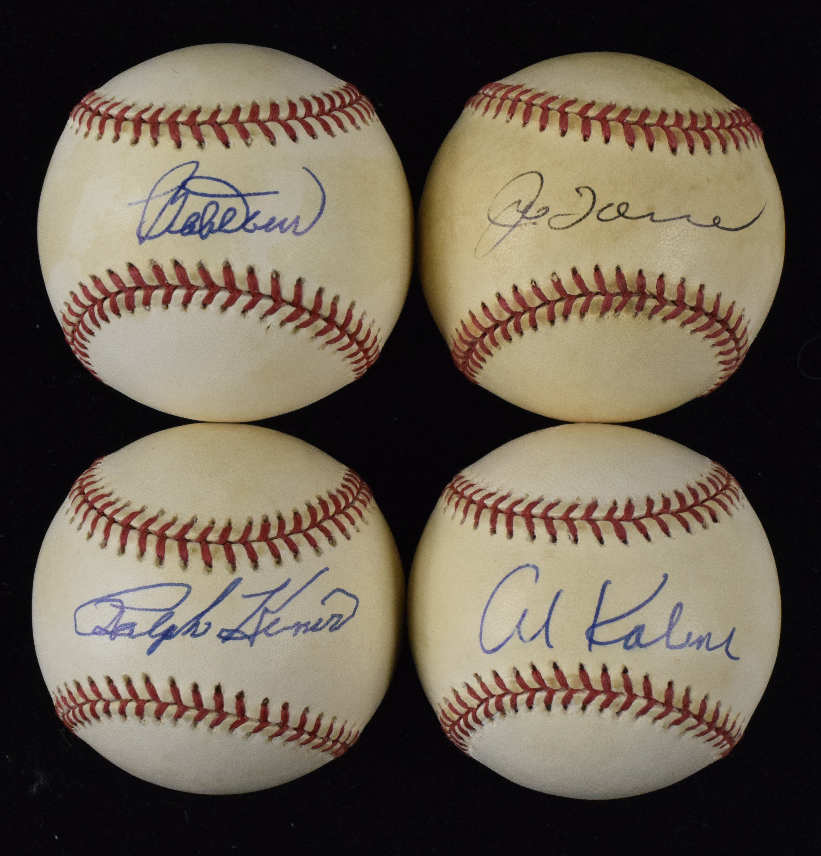 Description:Lot of (8) autographed baseballs with HOFers, including Kaline, Torre and Kiner (Sigs. NM-NM/MT). Lot includes (5) on G. Budig A.L. baseballs, individually signed by Bobby Doerr, Al Kaline, George Kell with "HOF 83" inscirption, Virgil Trucks with "2 no hitter" inscription and Joe Torre; (2) on L. Coleman N.L. balls, individually signed by Ralph Kiner and Bobby Cox and (1) Minor League Practice ball signed by Jim Mudcat Grant. Signatures rate 7/8 out of 10, and balls have light to heavy toning: VG/EX-NM.