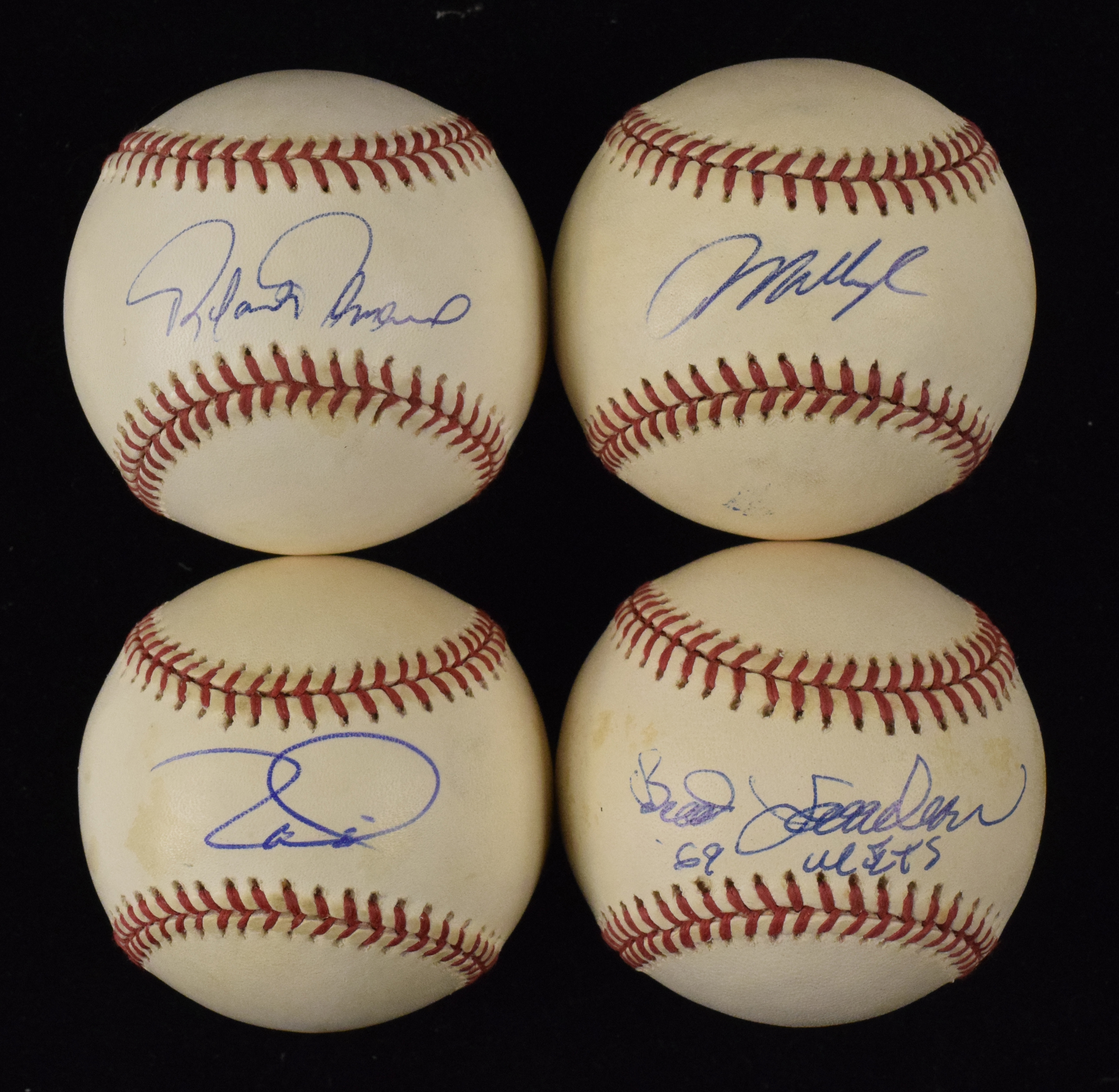 Description:Lot of (12) autographed baseballs, including Lincecum, Vaughn and Palmeiro (Sigs. NM/MT-MT). All are on official A.L. or N.L. baseballs, and have been individually signed by Rafael Palmeiro, Tim Lincecum, Mo Vaughn, Todd Walker, Bartolo Colon, Brad Radtke, Greg Vaughn, Ron Villone, Howard Johnson, Chad Curtis, Bud Harrelson and Josh Hamilton. Signatures rate 8/9 out of 10, and balls have light to heavy toning: VG-NM.