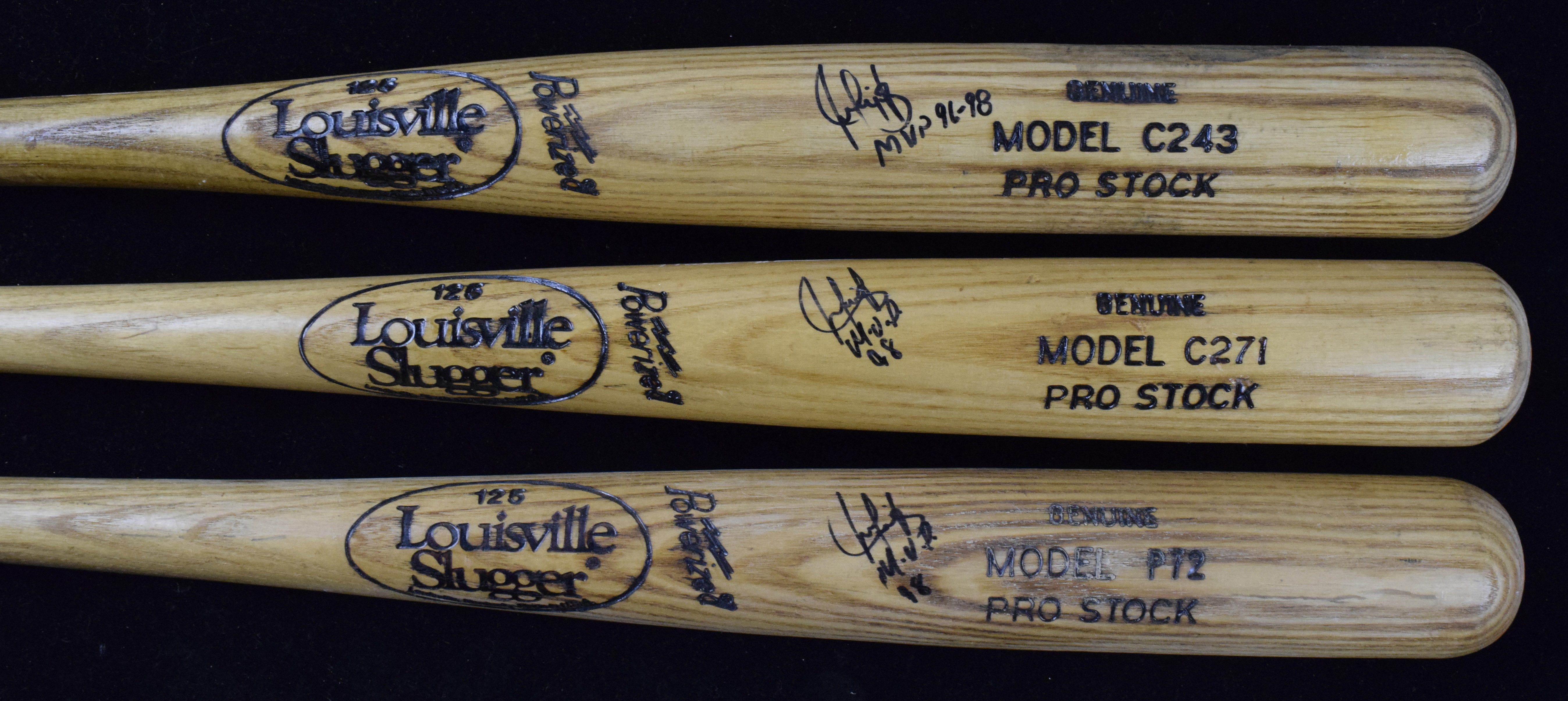 Description:Lot of (3) Juan Gonzalez signed and inscribed Louisville Slugger pro stock baseball bats (Sigs. NM-NM/MT). Lot includes (3) Louisville Slugger pro stock bats with (1) 34" Model C243 (cracked handle and evident use) signed by Gonzalez with "MVP 96-98" inscription; (1) 34" Model C271 (evident use) signed by Gonzalez with "MVP 98" inscription: and (1) 33" Model P72 (wear/discoloration) signed by Gonzalez with "MVP 98" inscription. All three knobs have been blacked-out with marker. Signatures rate 7/8 out of 10, and bats range GD-VG/EX.