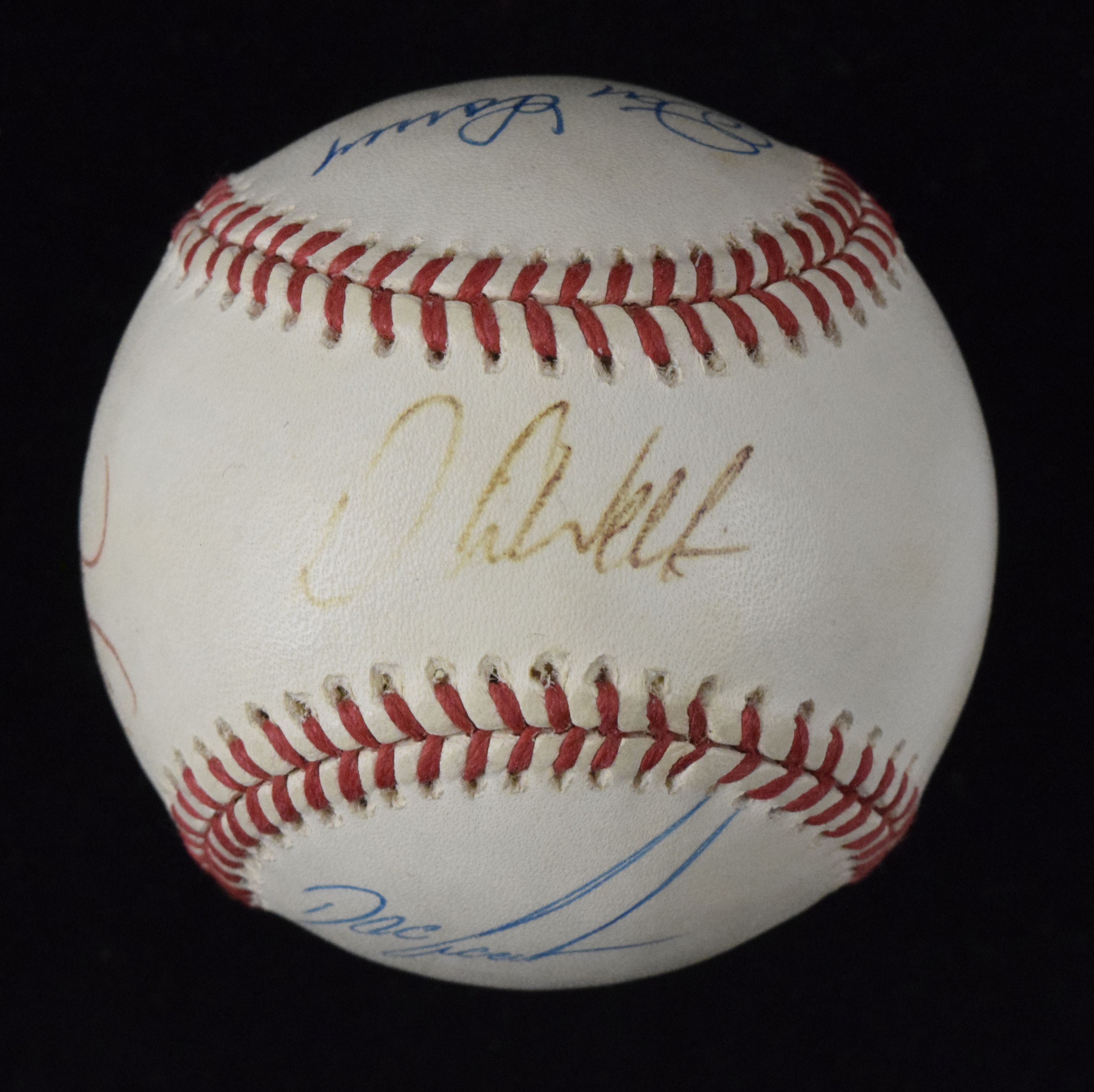 Description:N.Y. Yankees no hitter & perfect game baseball signed by (6), including Abbot, Wells & Larsen (Sigs. VG/EX-MT). Desirable G. Budig A.L. baseball has been signed by (6) of (13) the pitchers who threw either a perfect game or no hitter in the history of the N.Y. Yankees. David Wells signed on the sweet spot (some fading), with additional side panel signatures from Jim Abbott, David Cone, Dave Righetti, Dwight Gooden and Don Larsen. Signatures range from 4 to 9 (avg, 6/7) out of 10, and ball is lightly toned: EX/MT.