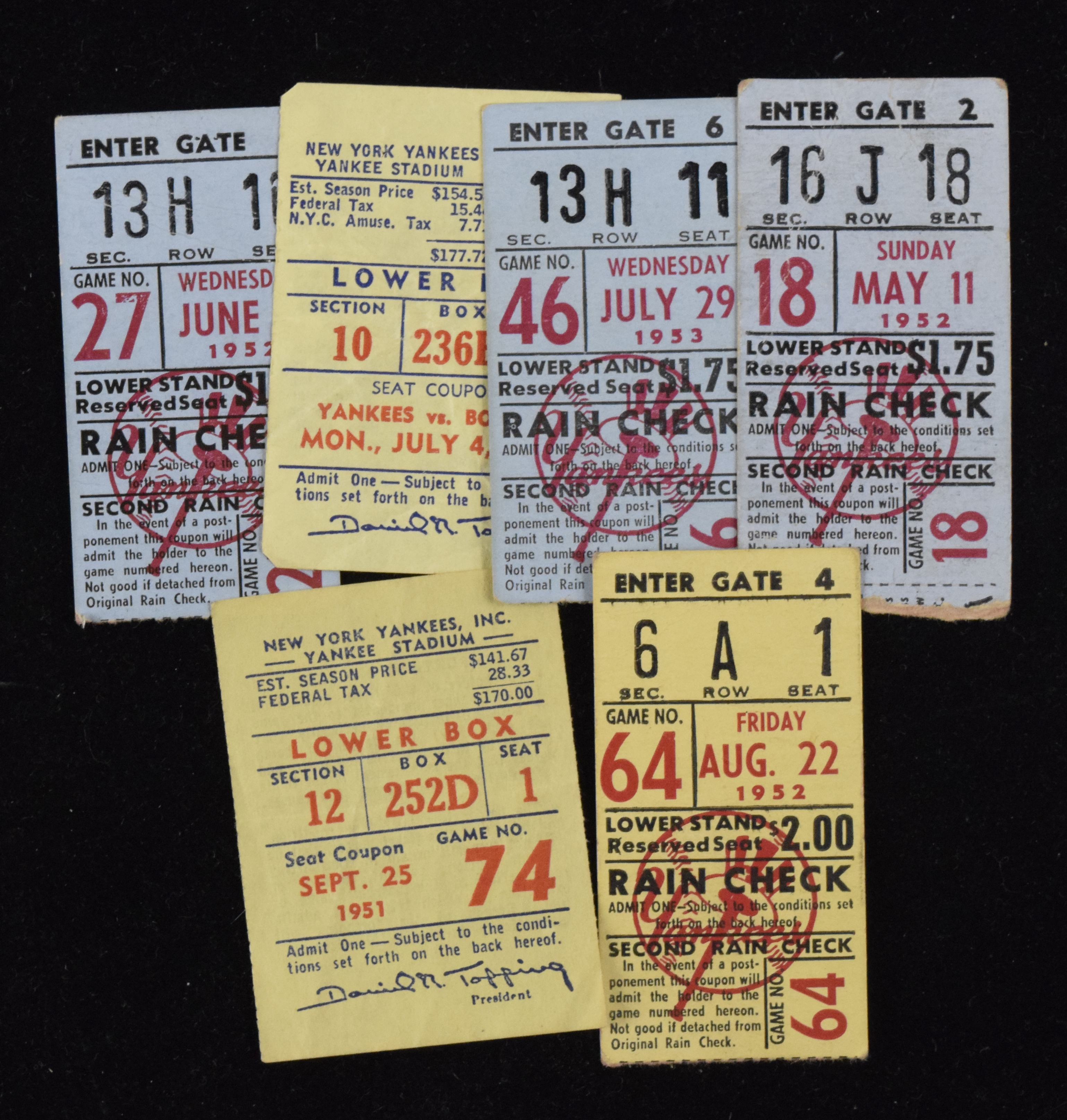 Collection of (13) 1951-1955 N.Y. Yankees regular season ticket stubs (PR-VG/EX). Nice assortment of vintage ticket stubs from Yankee stadium, with (2) Sept. 25, 1951 lower box stubs; (3) June 4, 1952 lower stands stubs; (1) May 11, 1952 lower stand stub; (1) June 3, 1952 lower box seat stub; (1) June 2, 1952 lower box seat stub; (2) Aug. 22, 1952 lower stand stubs; (1) June, 18 1953 grandstand stub; (1) July 29, 1953 lower stand stub; and (1) July 4, 1955 lower box stub. Most appear GD-VG. Range: PR-VG/EX.