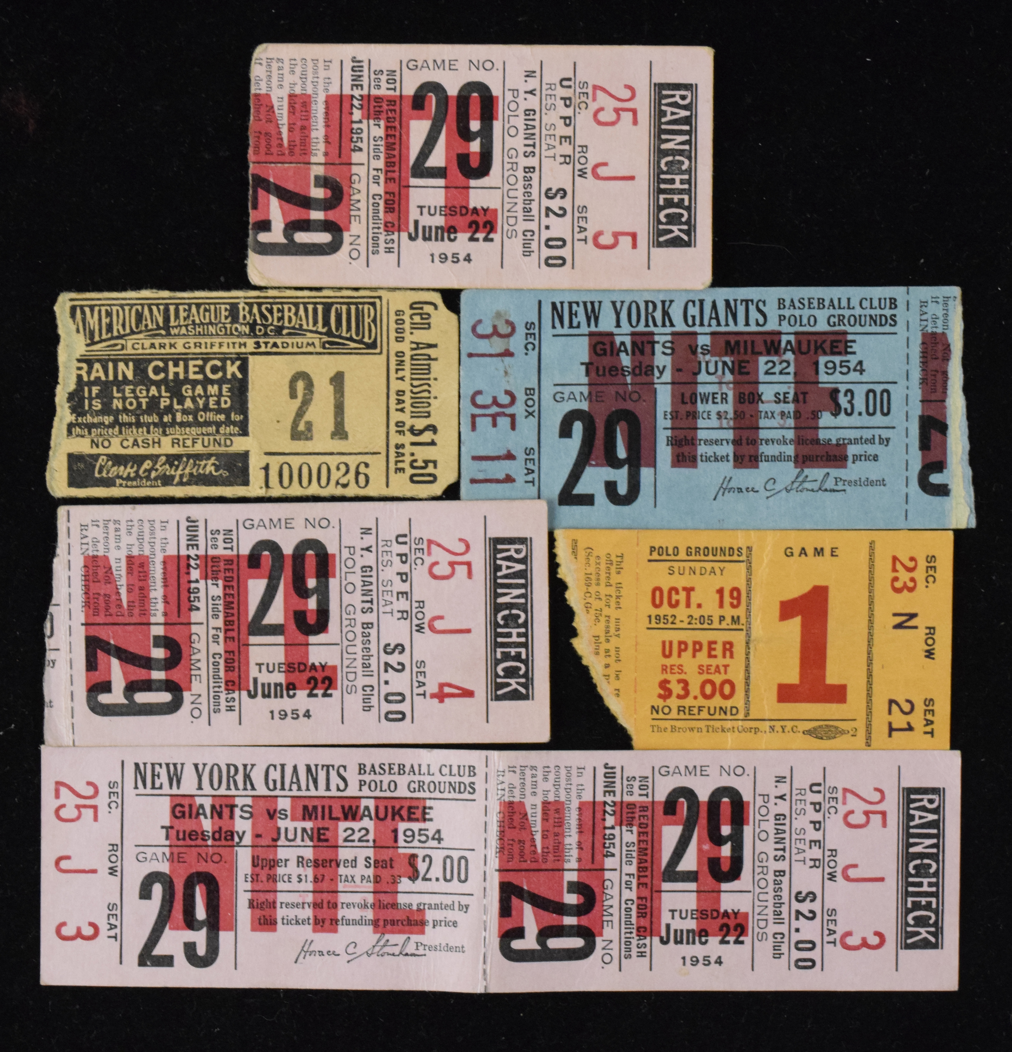 Description:Lot of (6) 1952-1954 tickets and stubs, including N.Y. baseball and football Giants (PR-VG). Nice assortment of vintage sports ticket stubs includes (1) Oct. 19, 1952 N.Y. football Giants vs. Chicago Cardinals at the Polo Grounds; (1) undated Washington Senators ticket stub at Clark Griffith Stadium (c. 1953); (1) June 22, 1954 N.Y. Giants vs. Milwaukee Braves full ticket at the Polo Grounds (Hank Aaron HR); and (3) June 22, 1954 N.Y. Giants vs. Miulwaukee Braves ticket stubs at the Polo Grounds (Hank Aaron HR). Most appear GD-VG. Range: PR-VG.