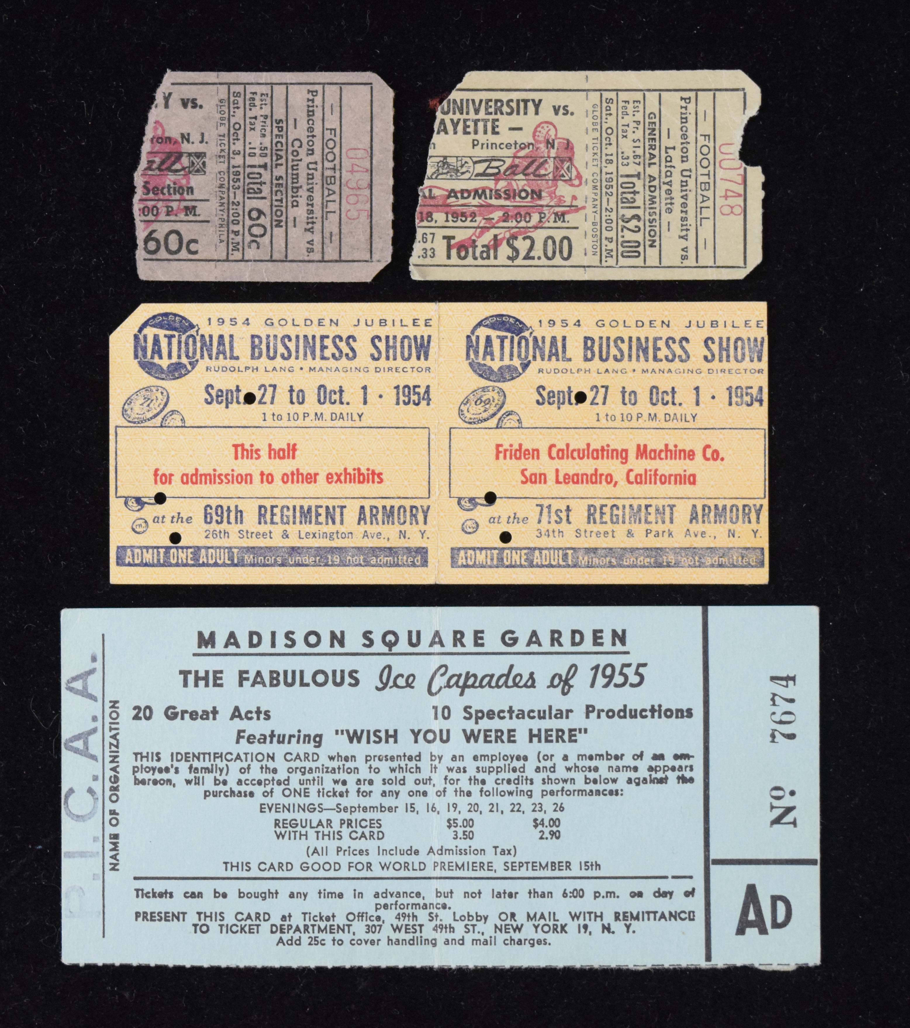 Description:Lot of (9) 1952-1955 ticket stubs, including Princeton football (PR-VG). Nice assortment of vintage tickets and stubs includes (2) Oct. 18, 1952 Princeton University vs. Lafayette at Palmer Stadium stubs; (4) Oct. 3, 1953 Princeton vs. Columbia at Palmer Stadium University stubs; (1) Sept. 15, 1955 Ice Capades World Premiere ticket; (2) connected Sept. 27-Oct. 1 1954 Golden Jubilee National Business Show tickets at the 69th Regiment Armory; and (1) Jan. 19, 1954 Ice Revue at the Madison Square Garden stub. Most appear GD-VG. Range: PR-VG.