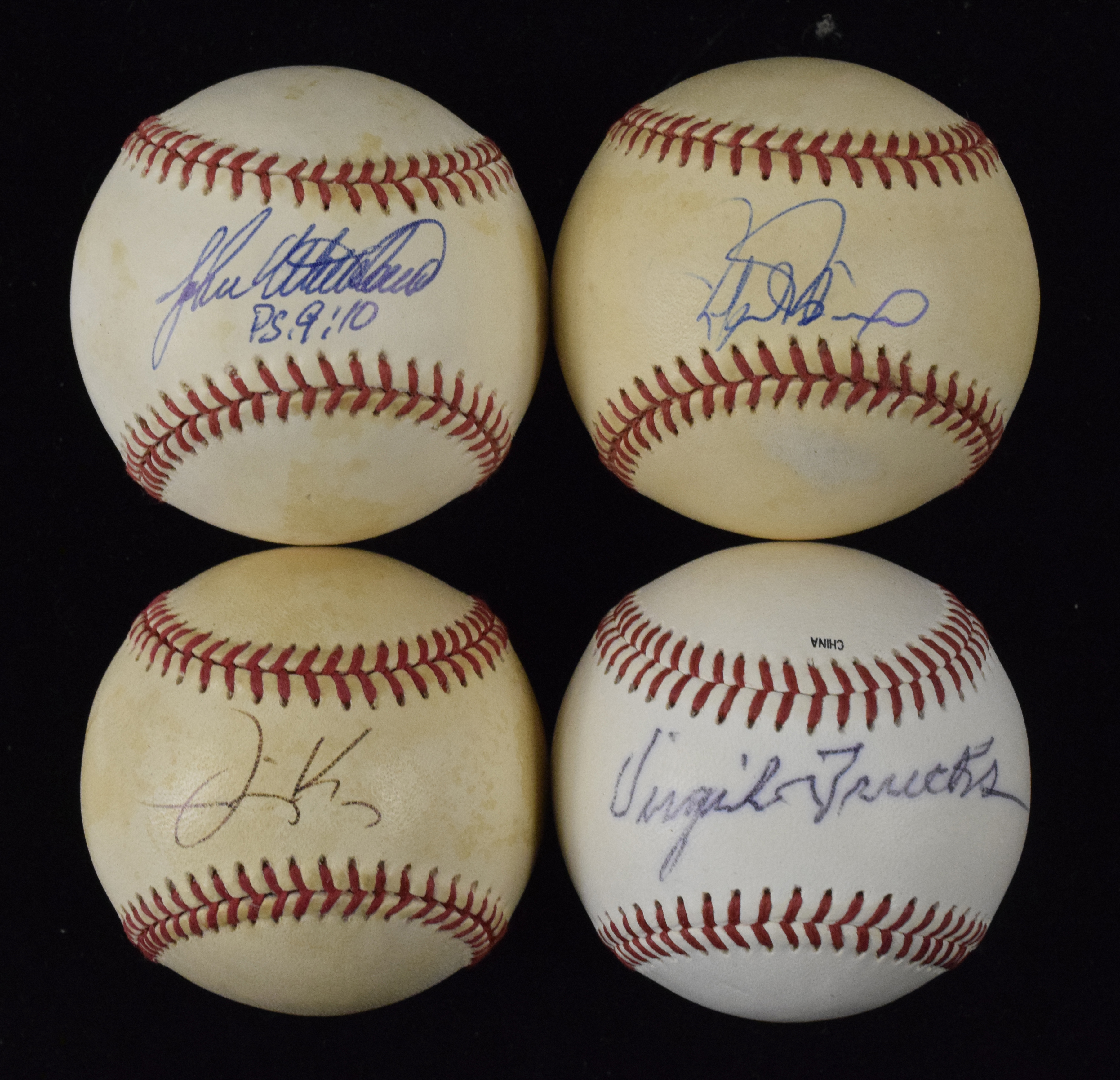 Description:Lot of (12) autographed baseballs, including Palmeiro, Wetteland and Key (Sigs. EX/MT-MT). All are on official A.L. or N.L. baseballs, and have been individually signed by Rafael Palmeiro, Edgardo Alfonzo, Rey Ordonez, Jimmy Key, (2) Ramiro Mendoz, Chuck Knoblauch, Albert Belle, Virgil Trucks, Bobby Jones, Rick Reed and John Wetteland. Signatures range from 6 to 9 (avg. 8) of 10, and balls have light to heavy toning: VG-NM.