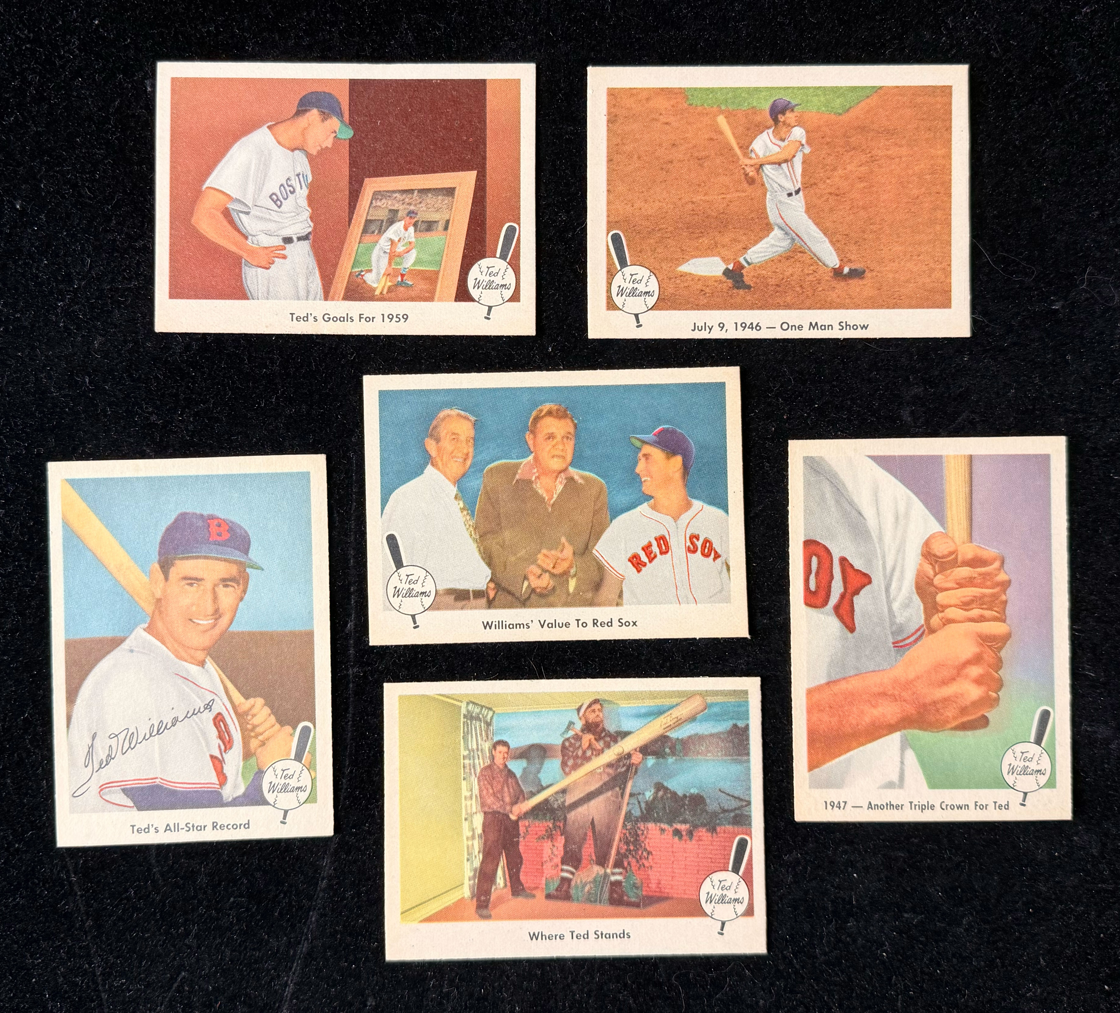Description:High-grade 1959 Fleer Ted Williams partial set (53/80) with pack-fresh cards (EX-MT-NM/MT+ overall). Crisp near-complete set offers (53) different cards of the (80) issued. Highlights include #s 33 Another Triple Crown for Ted (NM/MT), 63 Ted's All-Star Record (NM), 75 Williams' Value to Red Sox (NM/MT) and 80 Ted's Goal for 1959 (EX+). Balance of the near-set appears mostly EX/MT-NM/MT+ with some less here and there most cards appearing pack-fresh, including many with nice centering. Full range: EX-MT. ($500-$750)