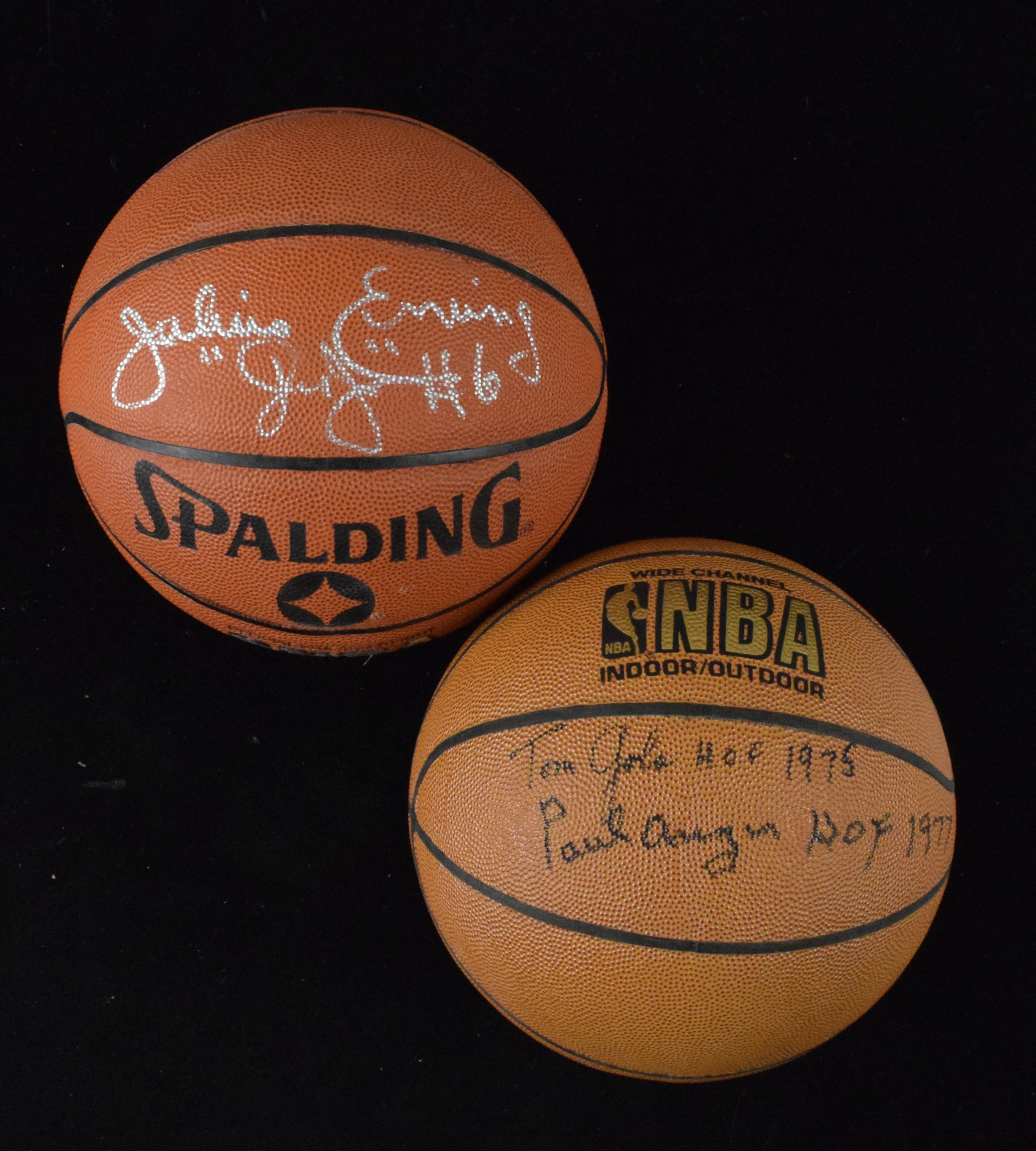Description:Lot of (2) autographed basketballs, with Julius Erving and Tom Gola/Paul Arizin (Sigs. NM/MT). Lot includes (1) Spalding Indoor/Outdoor basketball signed in silver marker by Julius Erving with "Dr. J" and "#6" inscriptions and (1) Spalding Indoor/Outdoor basketball signed by Tom Gola with "HOF 1975" inscription and Paul Arizin with "HOF 1977" inscription. Signature rates 8 out of 10 and basketballs are slightly deflated: EX/MT.