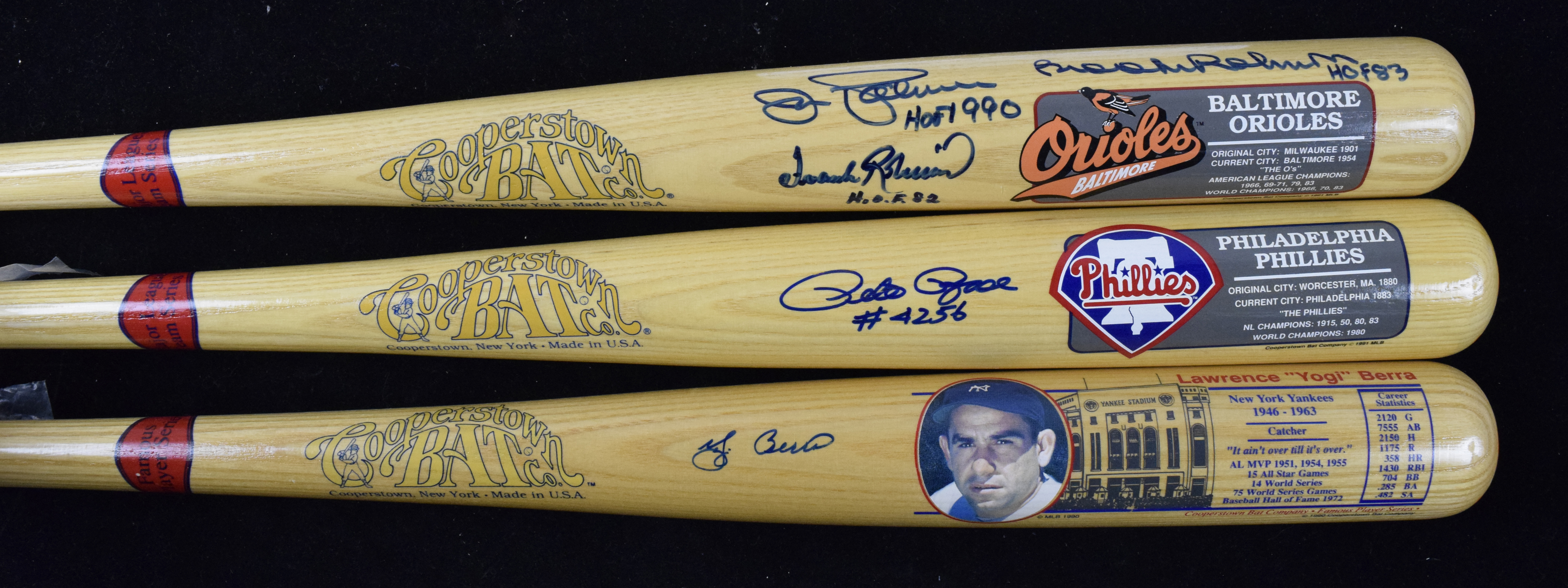 Description:Lot of (3) Cooperstown Bat Co. autographed bats, with Rose, Orioles HOF and Berra (Sigs. MT). Nice assortment of 34" Cooperstown Bat Co. logo bats, with (1) signed by Yogi Berra; (1) signed by Jim Palmer, Brooks Robinson and Frank Robinson, each of whom added HOF year inscriptions and (1) signed by Pete Rose with "#4256" inscription. Blue marker signatures rate 9 out of 10, and bats have little to no wear: NM/MT.