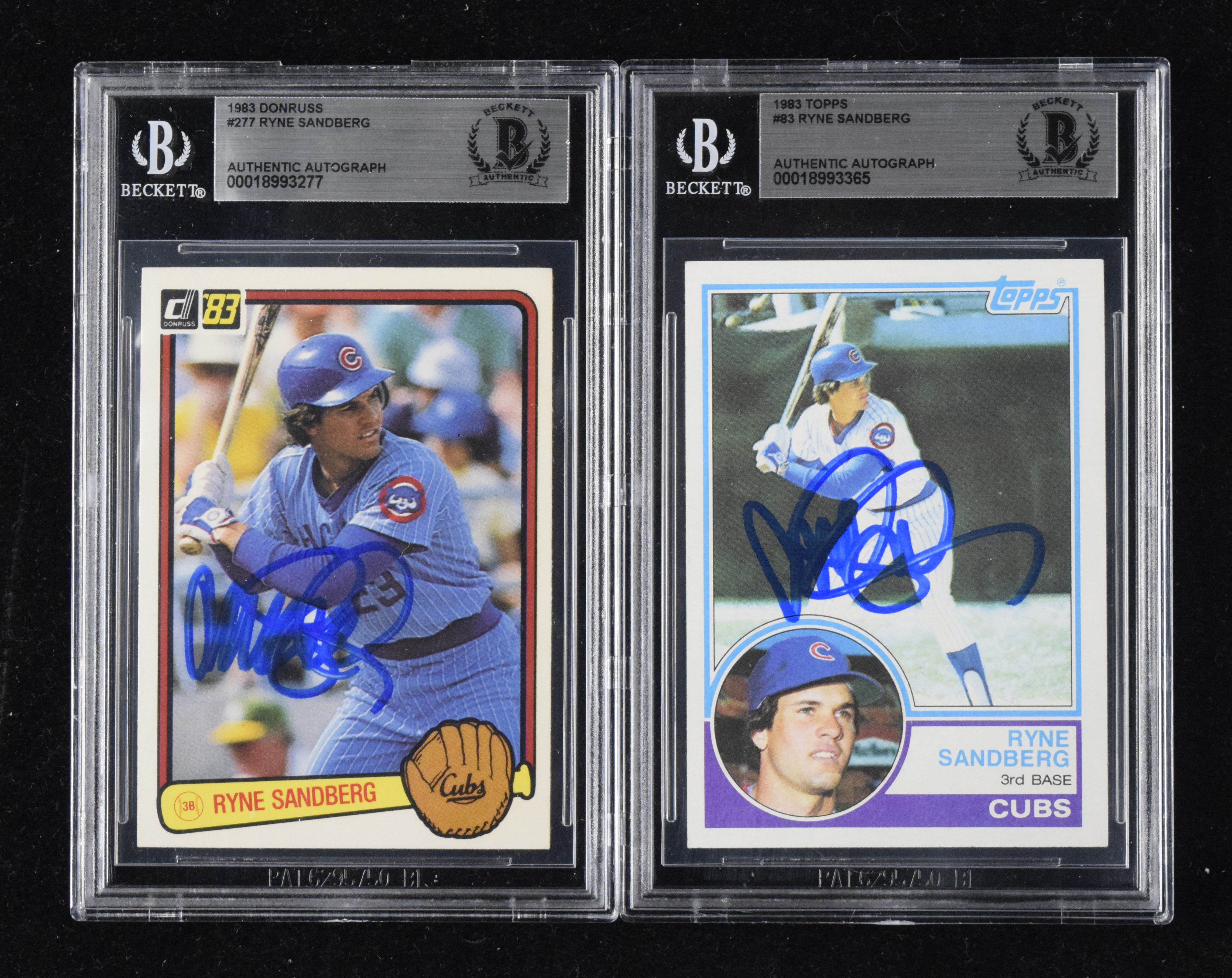 Description:Lot of (2) 1983 Ryne Sandberg autographed RCs, with Topps and Donruss (BGS Auth.; cards: EX/MT). Lot includes (1) 1983 Topps #83 Ryne Sandberg (EX/MT) and (1) 1983 Donruss #277 Ryne Sandberg (EX/MT). Both have been signed by Sandberg in blue marker, rating 9/10 out of 10 and authenticated and encapsulated by BGS. Range: EX/MT; BGS 10 Authentic.