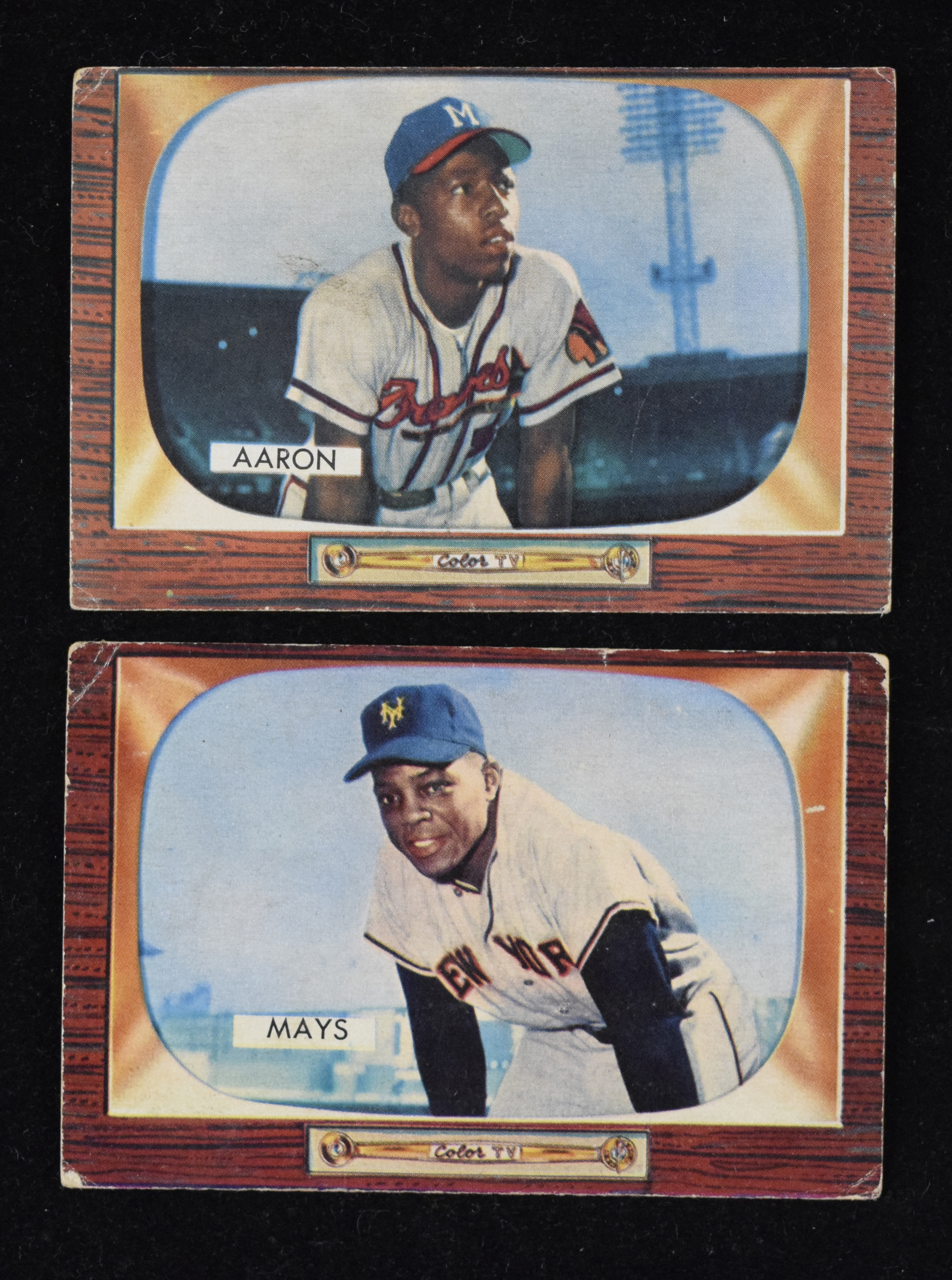Description:Lot of (2) 1955 Bowman HOFers, with Hank Aaron and Willie Mays (PR-FR). Low-grade lot of key cards from the 1955 Bowman set includes #179 Hank Aaron (FR) and #184 Willie Mays (PR). Backs of both have small areas of paper loss. Range: PR-FR.
