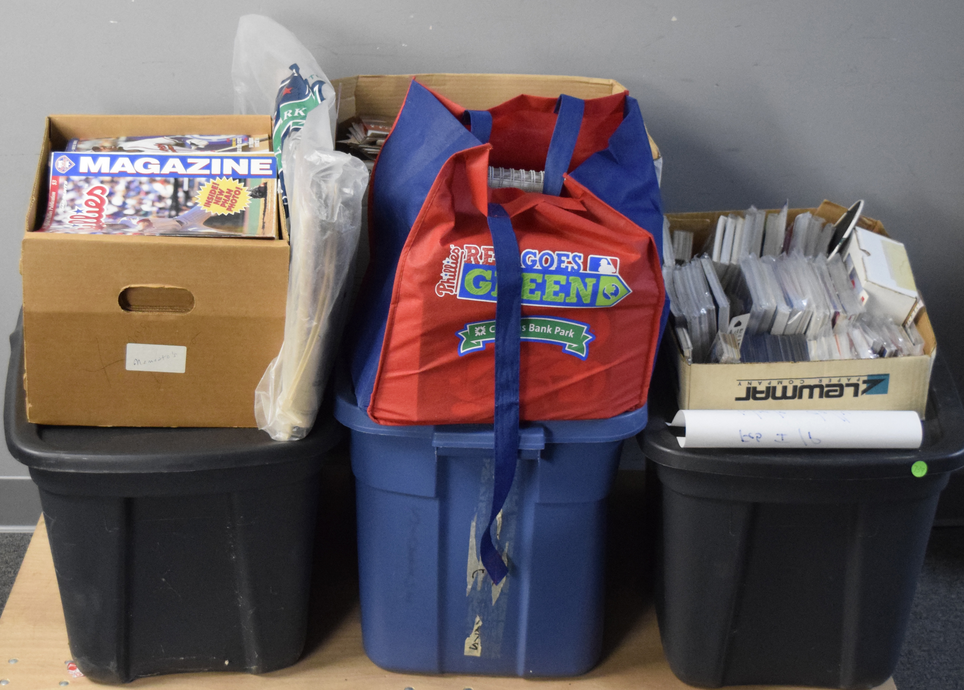 Description:Large lot of mostly modern Philadelphia Phillies publications with books, yearbooks & cards (EX-MT). Large quantity of publications includes (30+) hardcover and softcover books with many titles on the Phillies, Dallas Green, The Whiz Kids and more; (25+) 2000s Phillies media guides; (40+) 2000s Phillies yearbooks with a few other publications, including World Series; (80+) mostly 2000s Phillies magazines with some others; box of newspapers, magazines, calendars and other memorabilia featuring mostly Phillies, including 2008 World Series headlines; (8) 2007-2013 Philadelphia Phillies Phan Photo sets in binders, box with (1,000+) mostly 2000s Phillies team sets, postcards and baseball cards, several rolled posters and more. Note: Due to the weight of the lot, local pickup is recommended. Range all items: EX-MT.