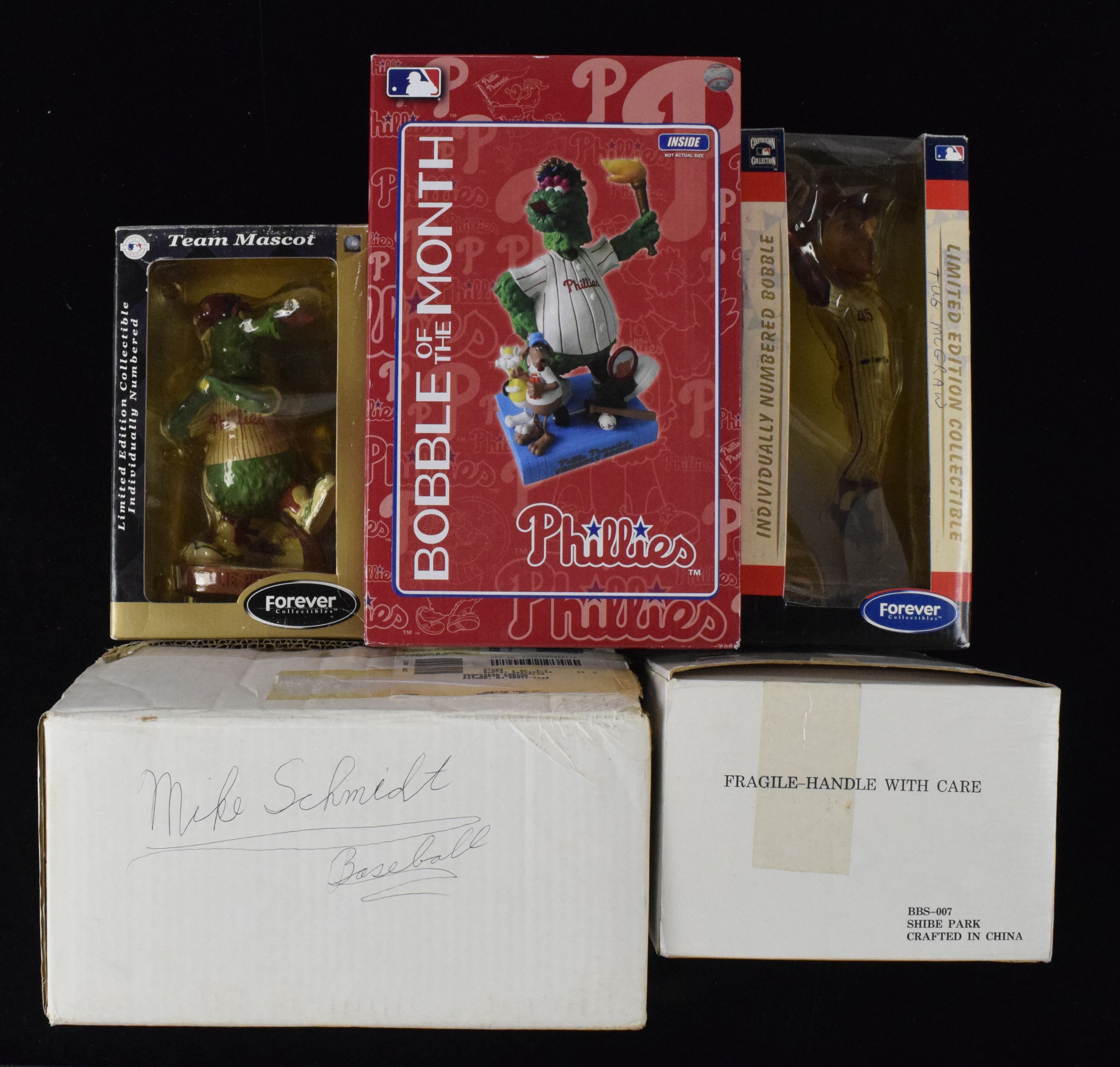 Description:Lot of (10) Phillies bobbleheads and figurines in original boxes with Danbury Mint, Phanatic (NM; NIB). Each remains untouched in its original box and packaging, with (5) Forever Collectibles Phillie Phanatic bobbleheads (Citizens Bank Park Exclusives); (1) Jim Thome Danbury Mint figurine; (1) Mike Schmidt Danbury Mint figurine; (1) Shibe Park mini-stadium replica; (1) Forever Collectibles Tug McGraw bobblehead and (1) Forever Collectibles Phanatic bobblehead. Boxes show mostly light wear (EX-NM) and figurines/bobbleheads are untouched and presumed to be NM or better.