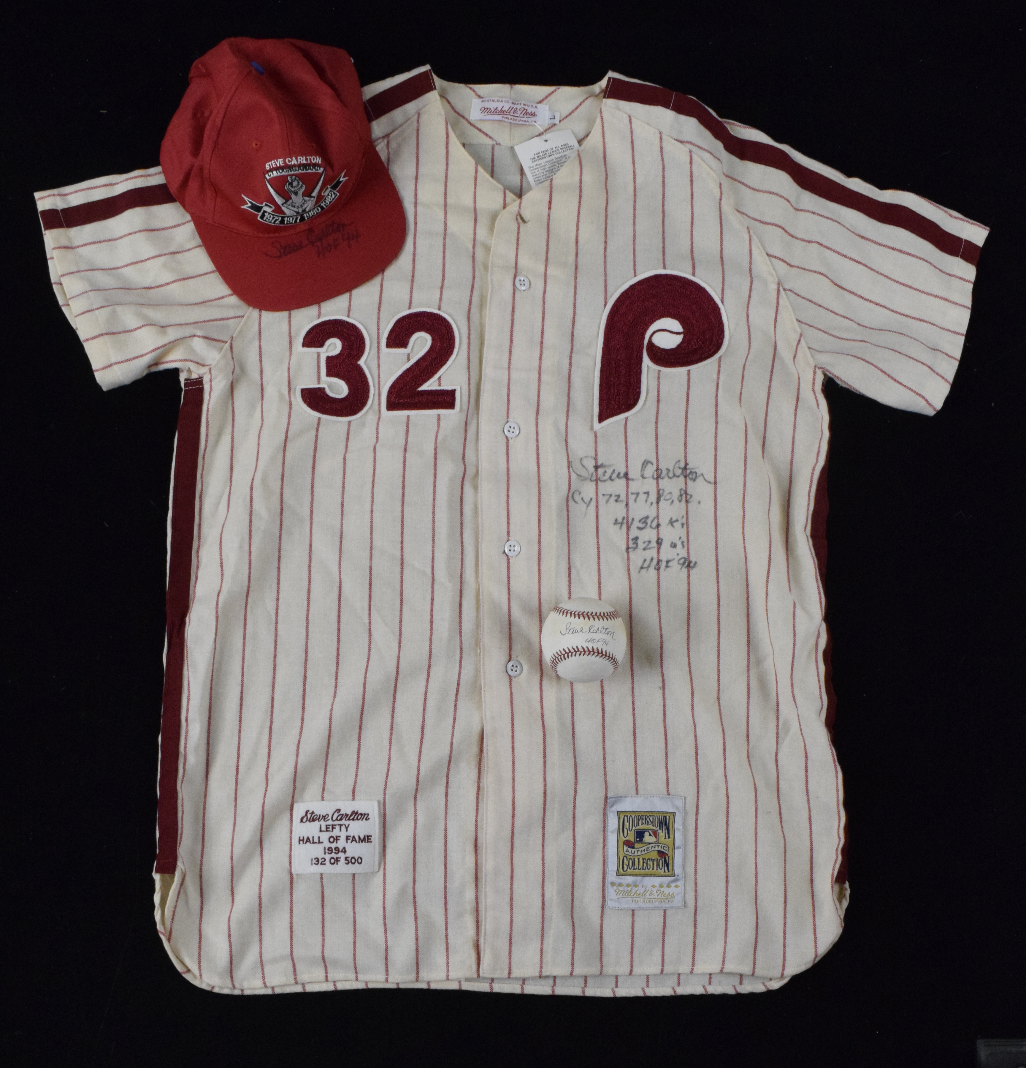 Description:Lot of (3) Steve Carlton autographed items, including Mitchell & Ness jersey (Sigs. NM-NM/MT). Lot includes (1) size L Mitchell & Ness Steve Carlton jersey with original retail tags and signed by Carlton with (4) career-related inscriptions; (1) L. Coleman N.L. baseball signed by Carlton with "HOF 94" inscription and (1) Steve Carlton Cy Young Award logo hat signed on the bill with "HOF 94" inscription. Signatures rate 7/8 out of 10, and items range EX-NM.