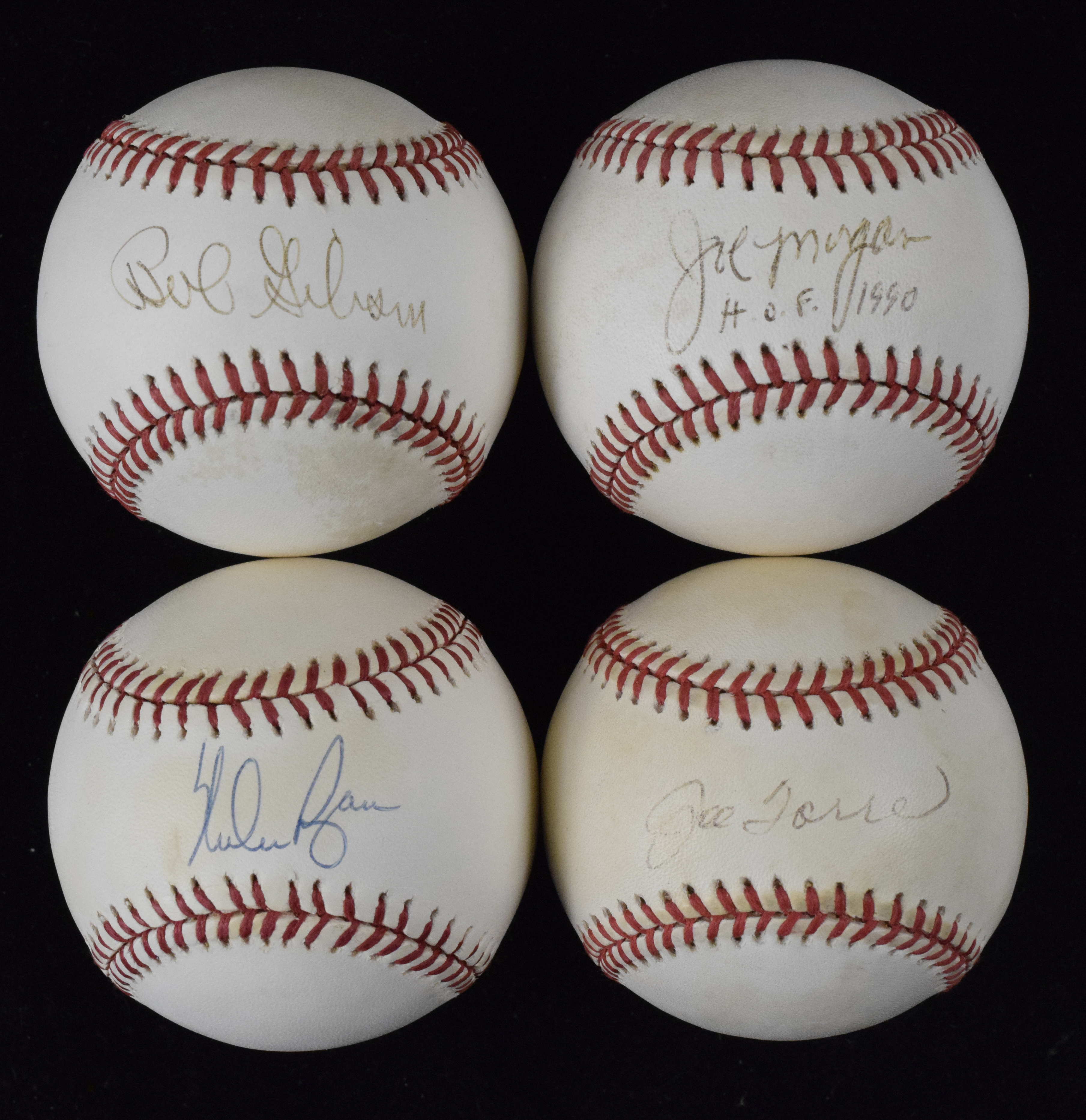 Description:Lot of (4) HOFer autographed baseballs, with Ryan, Gibson, Morgan and Torre (Sigs. VG/EX-NM/MT). Lot includes (2) W. White N.L. baseballs, individually signed by Joe Morgan with "HOF 1990" inscription and Bob Gibson (signatures slightly faded, rating 6 out of 10) and (2) G. Budig A.L. baseballs, individually signed by Joe Torre (faded, rating 4 out of 10) and Nolan Ryan, rating 8 out of 10. Signatures range from 4 to 8 out of 10, and balls have light to moderate toning: EX-NM.