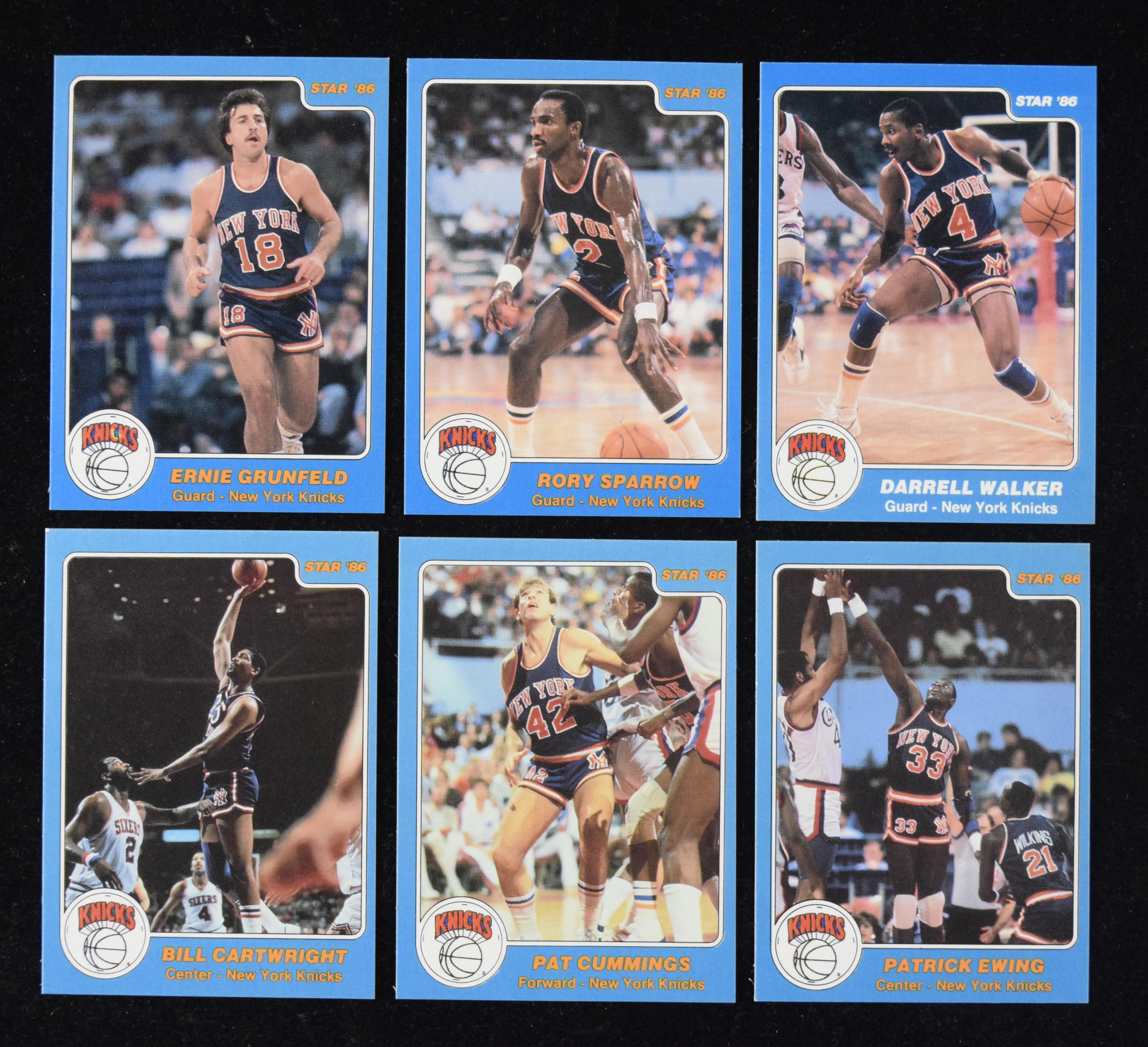 Description:Lot of (7) 1985-86 Star Basketball N.Y. Knicks cards with Patrick Ewing RC (NM-NM/MT). Very nice assortment of Star Knicks cards is highlighted by the rookie card #166 of Patrick Ewing (NM), along with #s 167-172 Ernie Grunfeld, Rory Sparrow, Bill Cartwright, Pat Cummings, Darrell Walker and Trent Tucker. Cards appear NM-NM/MT overall.