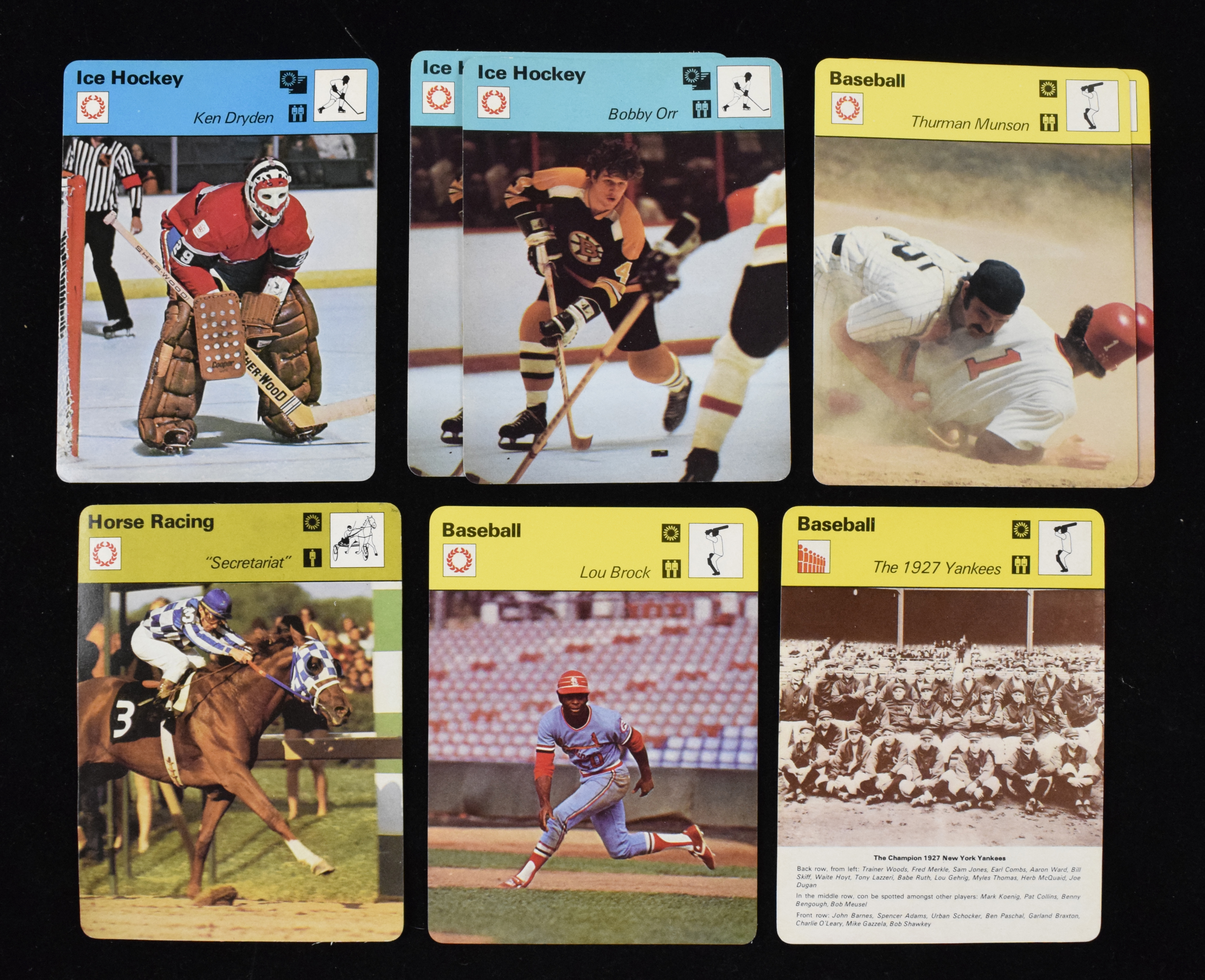 Description:Lot of (16) 1977 Sportscaster cards, including (2) Bobby Orr (VG/EX-EX/MT). Multi-sport lot includes (2) Bobby Orr, Lou Brock, (2) Thurman Munson, Ken Dryden, the 1927 Yankees, Secretariat, USA-USSR and others. Range: VG/EX-EX/MT.