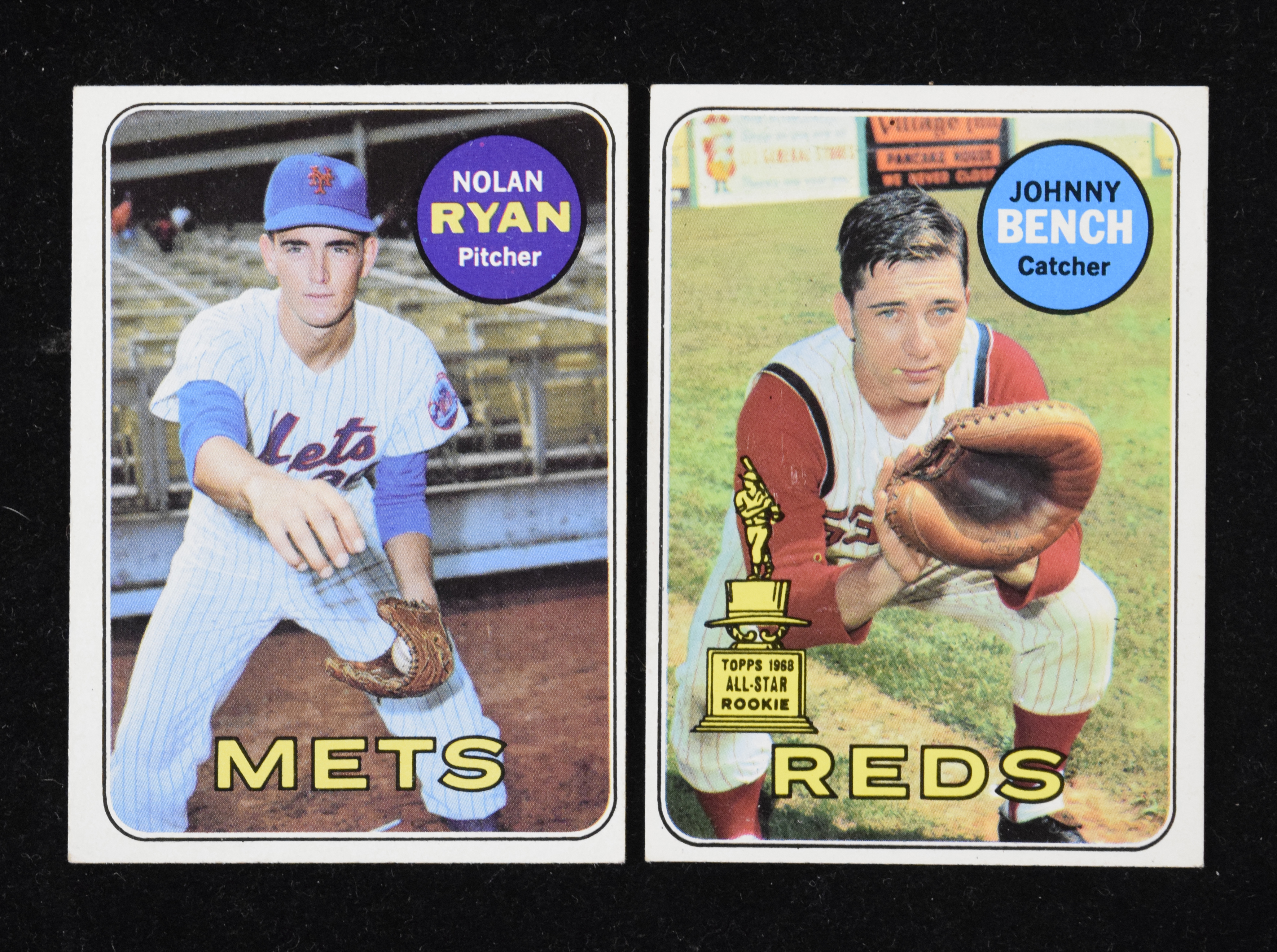 Description:Lot of (2) 1969 Topps key cards, with Nolan Ryan and Johnny Bench (VG/EX OC). Pair of key Hall of Famers from the 1969 Topps set includes (1) #95 Johnny Bench (VG/EX OC) and (1) #533 Nolan Ryan #533 (VG/EX OC). Backs of both are clean: VG/EX OC.