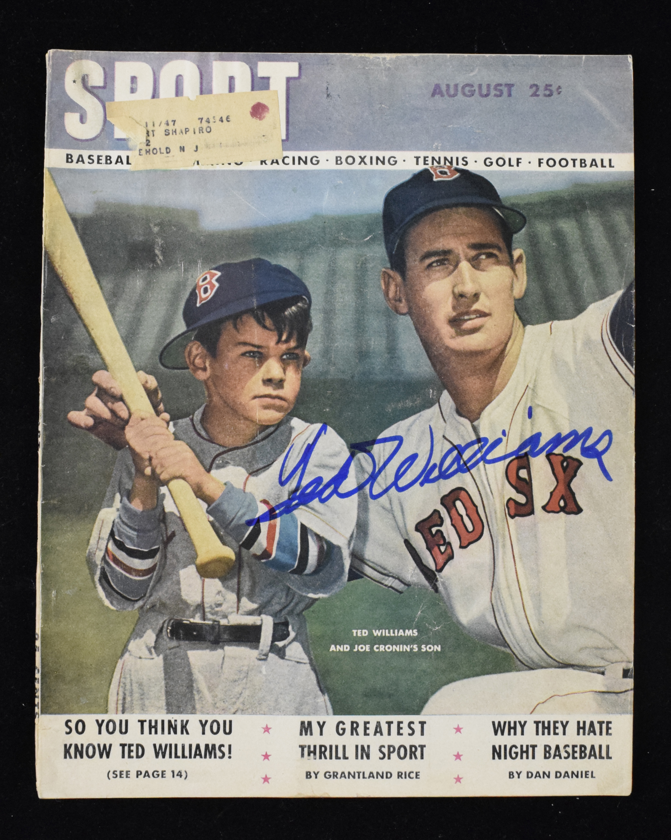 Description:Ted Williams autographed 1947 Sport magazine (Sig. MT). August 1947 Sport magazine with Ted Williams on the cover has been signed in blue marker by Williams, rating 10 out of 10. Magazine with mailing label affixed has moderate to heavy wear: VG.