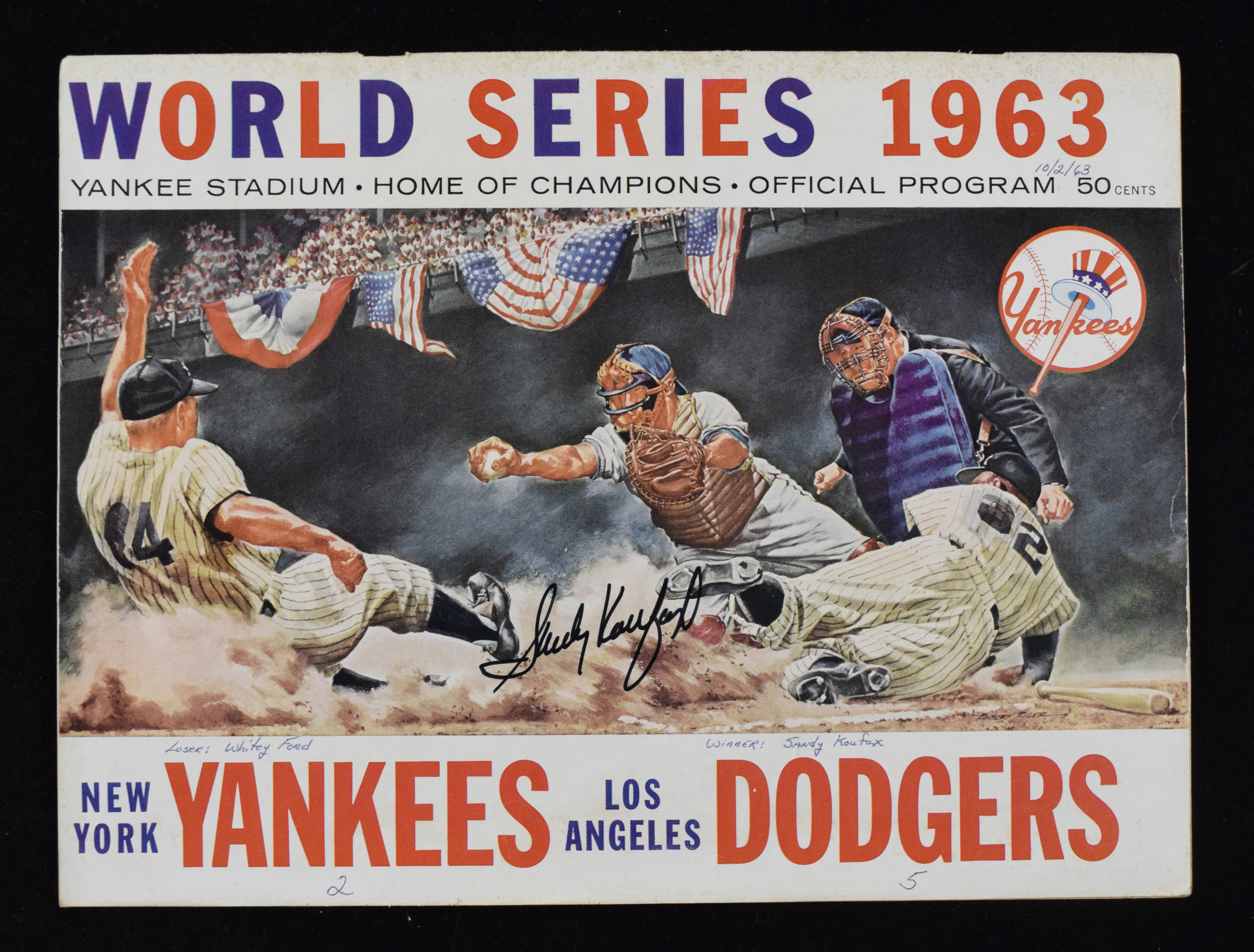 Description:1963 World Series program autographed by MVP Sandy Koufax (Sig. NM, Program GD) Original program has been signed on the cover in marker rating 9/10 out of 10. Scored for Game (1) and there are some game related notations on the front cover. Handling wear including some fraying/discoloration to edges. Also includes some period game related newspaper clippings: Sig. NM, Program GD ($1,000-$2,000)