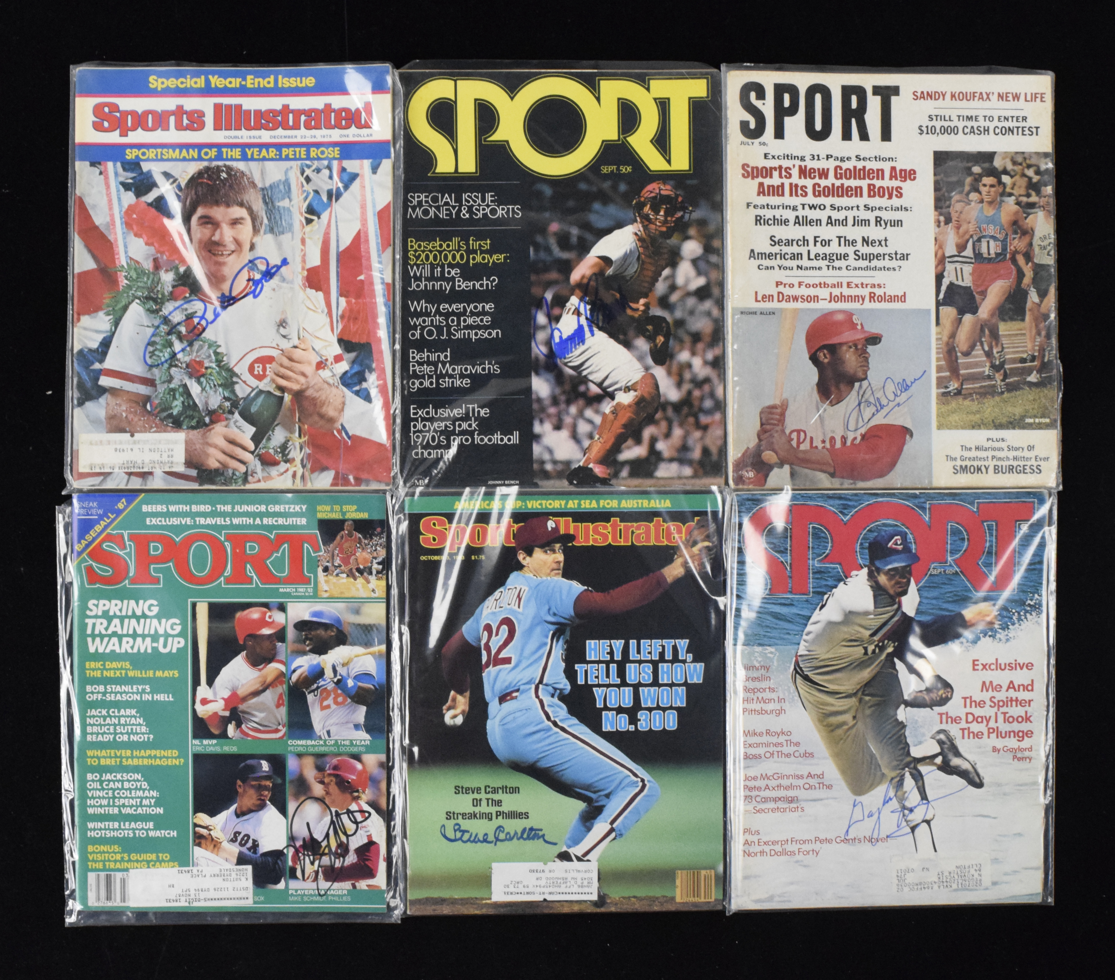Description:Lot of (6) star and HOFer-autographed magazines, with Rose, Schmidt and Bench (Sigs. MT). Nice assortment of signed 1960s-1980s magazines, including Sport magazine and Sports Illustrated. Magazines are individually signed by Richie Allen, Johnny Bench, Pete Rose, Steve Carlton, Gaylord Perry and Mike Schmidt. Signatures rate 9/10 out of 10, and magazines range VG/EX-EX/MT.