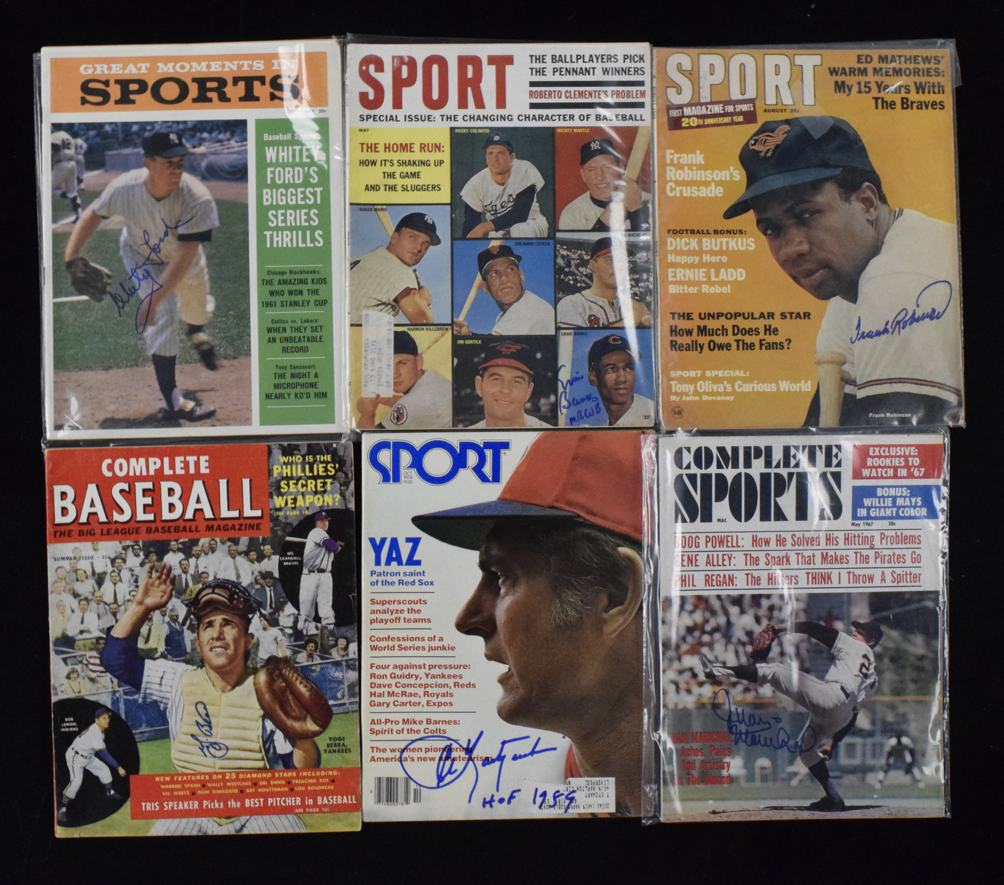 Description:Lot of (7) HOFer-autogaphed magazines, including Robinson, Banks and Ford (Sigs. MT). Nice assortment of signed 1950s-1970s magazines, including Sport magazine and Complete Baseball. Magazines are individually signed by Yogi Berra, Juan Marichal, Frank Robinson, Ernie Banks, Whitey Ford, Carl Yastrzemski with "HOF 1989" inscription and Brooks Robinson. Signatures rate 9/10 out of 10, and magazines range VG/EX-EX/MT.