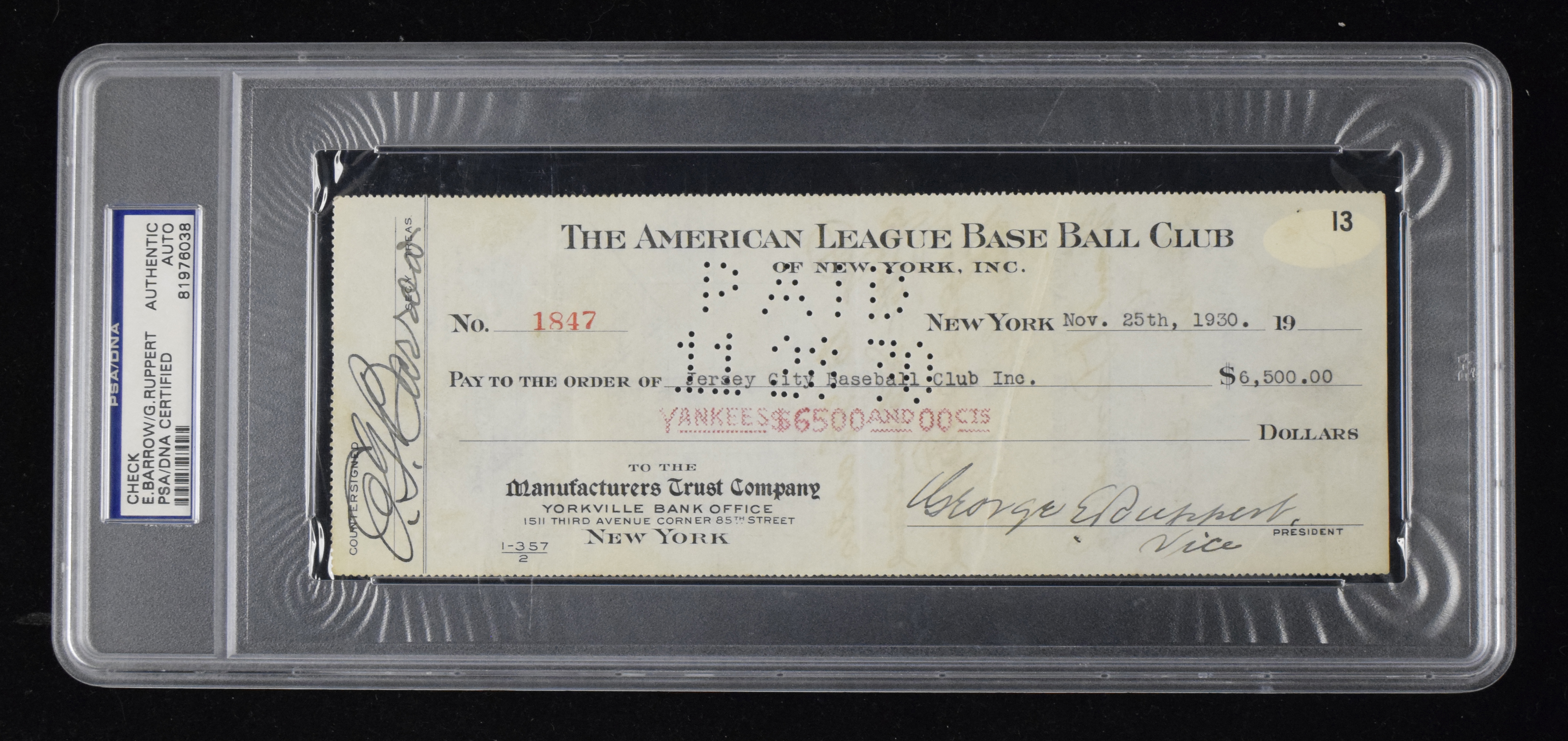 Description:George Ruppert and Ed Barrow dual-signed 1930 N.Y. Yankees check (PSA/DNA Authentic Autos.) Nov. 25, 1930 American League Baseball Club check has been signed on the front by N.Y. Yankees General Manager Ed Barrow, as well as Vice President George Ruppert. Signatures rate 8 out of 10, and has check has beeen been authenticated and encapsulated by PSA/DNA. Additionally, a JSA authentication sticker is affixed to the reverse of the check.