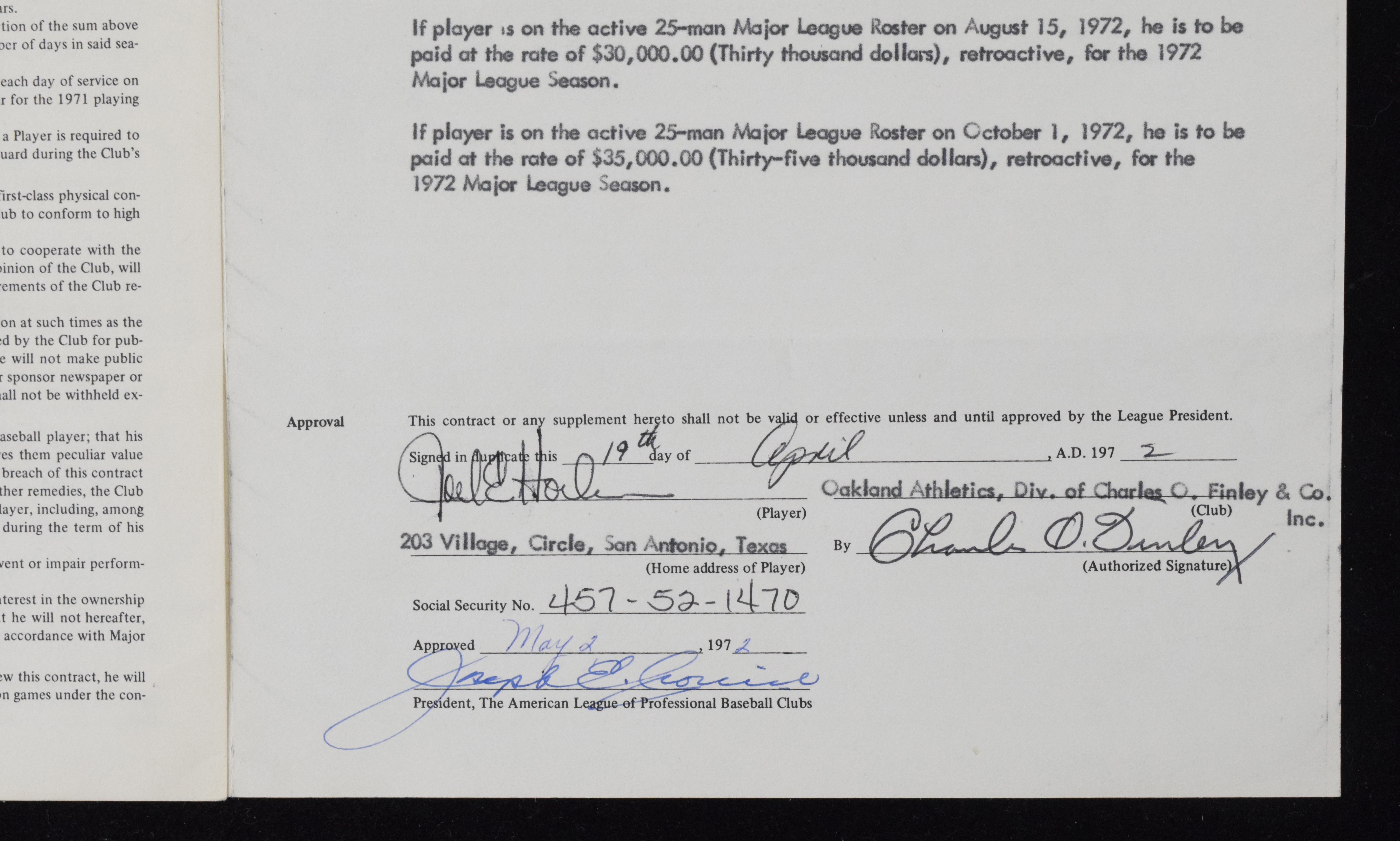 Description:1972 Oakland Athletics contract signed by Joel Horlen, Charles Finley and Joe Cronin PSA/DNA LOA (Sigs. NM/MT). Uniform Player's contract as executed between Joel Horlen and the Oakland Athletics for his services during the 1972 season. Signed by Horlen, A.L. President Joe Horlen, and Athletics owner Charles O. Finley. Fountain pen/ink signatures rate 8/9 out of 10. Typical mailing folds and a hint of light wear. Includes full LOA from PSA/DNA (sticker affixed to letter): Sigs. NM/MT; Contract EX.