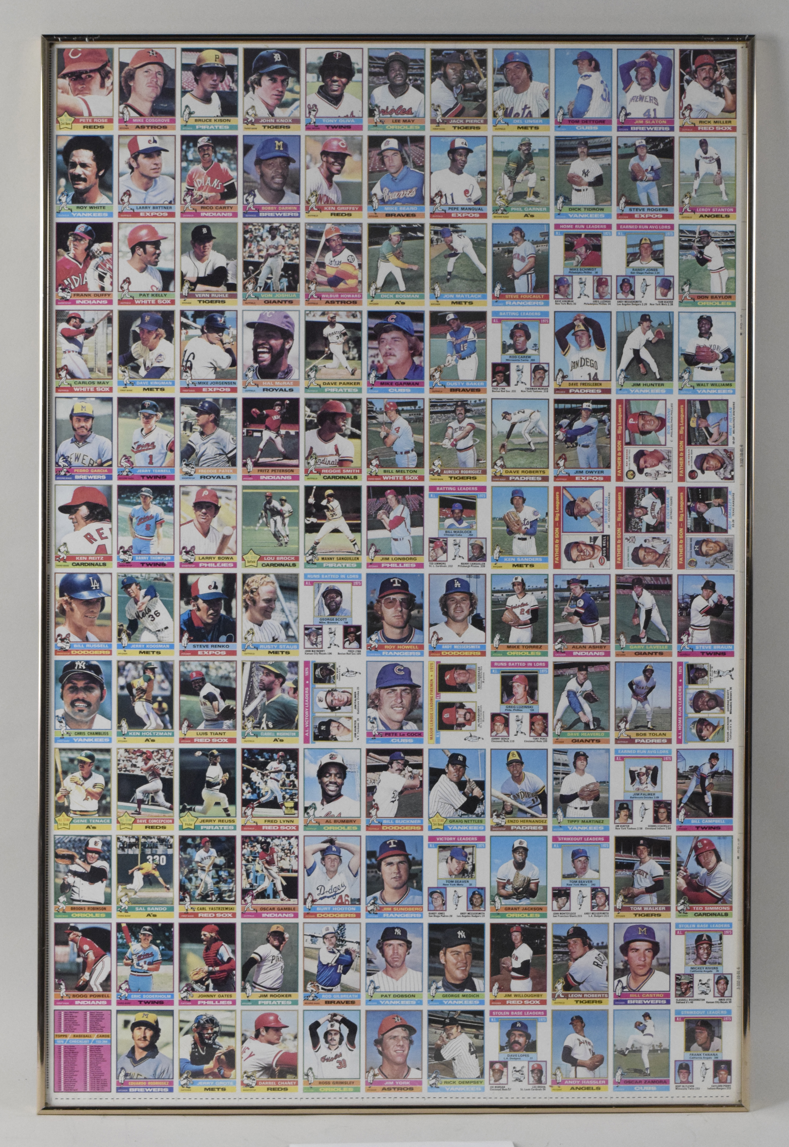 Description:1976 Topps Baseball uncut sheet with HOFers (GD-NM framed). Approx. 28.5"x43" framed 132-card sheet including Brooks Robinson, Carl Yastrzemski, Lou Brock, Catfish Hunter, Dave Parker, Tony Oliva, Ted Simmons, Pete Rose, NL HR Leaders, AL ERA Leaders, and others. Due to framing, complete conditions are unknown. Some wear can be seen at some of the edge and corner cards, but most interior cards appear fairly high grade: GD-NM