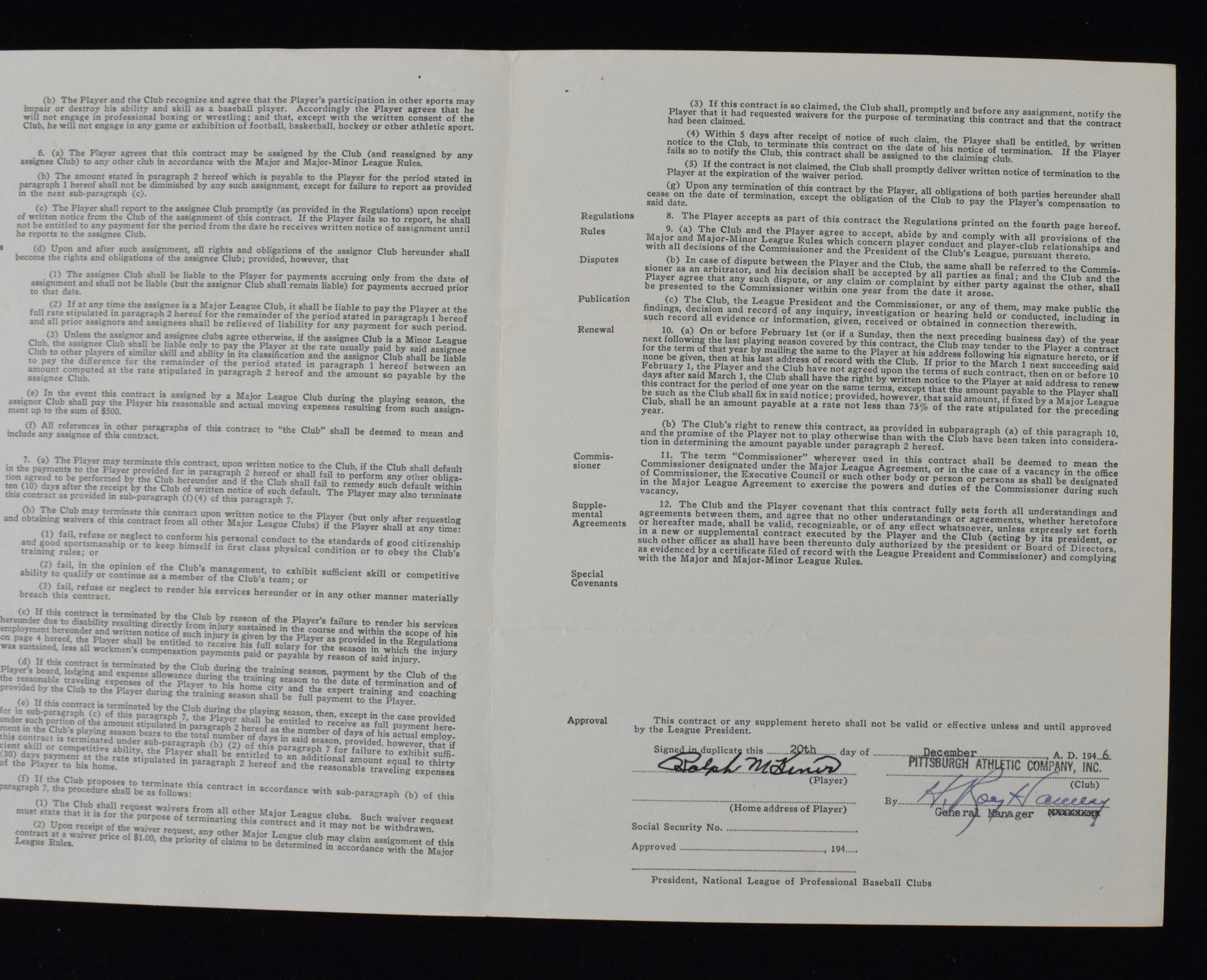 Description:1947 Ralph Kiner Pittsburgh Pirates signed duplicate player contract with PSA/DNA LOA (Sigs. NM/MT). Duplicate copy "National League of Professional Baseball Clubs Uniform Player's Contract" as executed between Kiner and the Pirates for his services for the 1947 season. Signed in the period by Kiner along with Roy Hamey, who was then G.M. of the team. Bold fountain pen/ink signatures rate 8/9 out of 10. Typical fold lines with light toning and incidental wear, along with staple holes. Includes full LOA from PSA/DNA (sticker affixed to letter). Sigs: NM/MT-MT; Contract: VG/EX. ($750-$1,000)