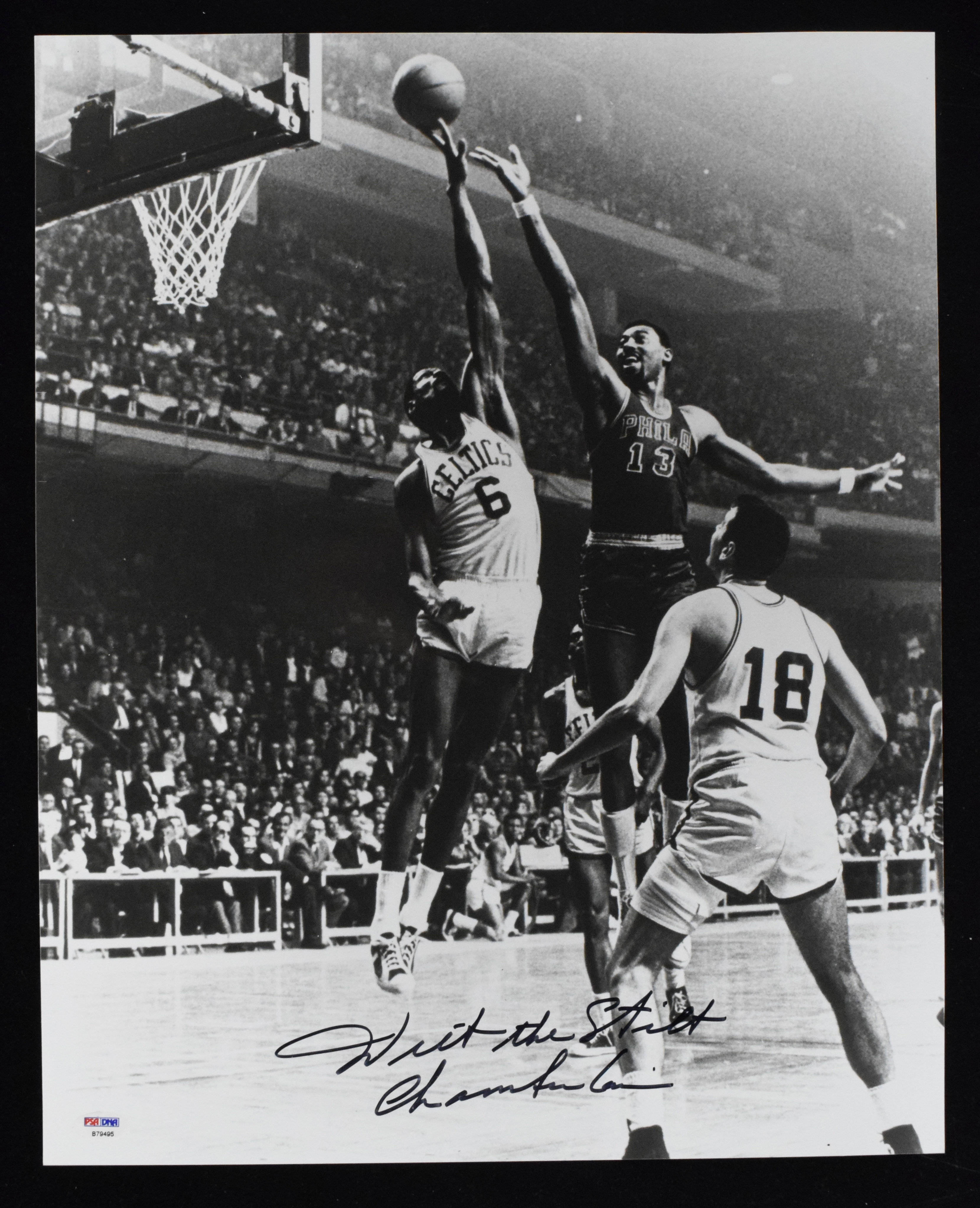 Description:Wilt "The Stilt" Chamberlain autographed 16"x20" photograph - PSA/DNA (NM). Chamberlain signed the photo in black marker. Signature rates 9 out of 10. PSA/DNA serial #ed sticker is on the photo: NM ($500-$1,000)