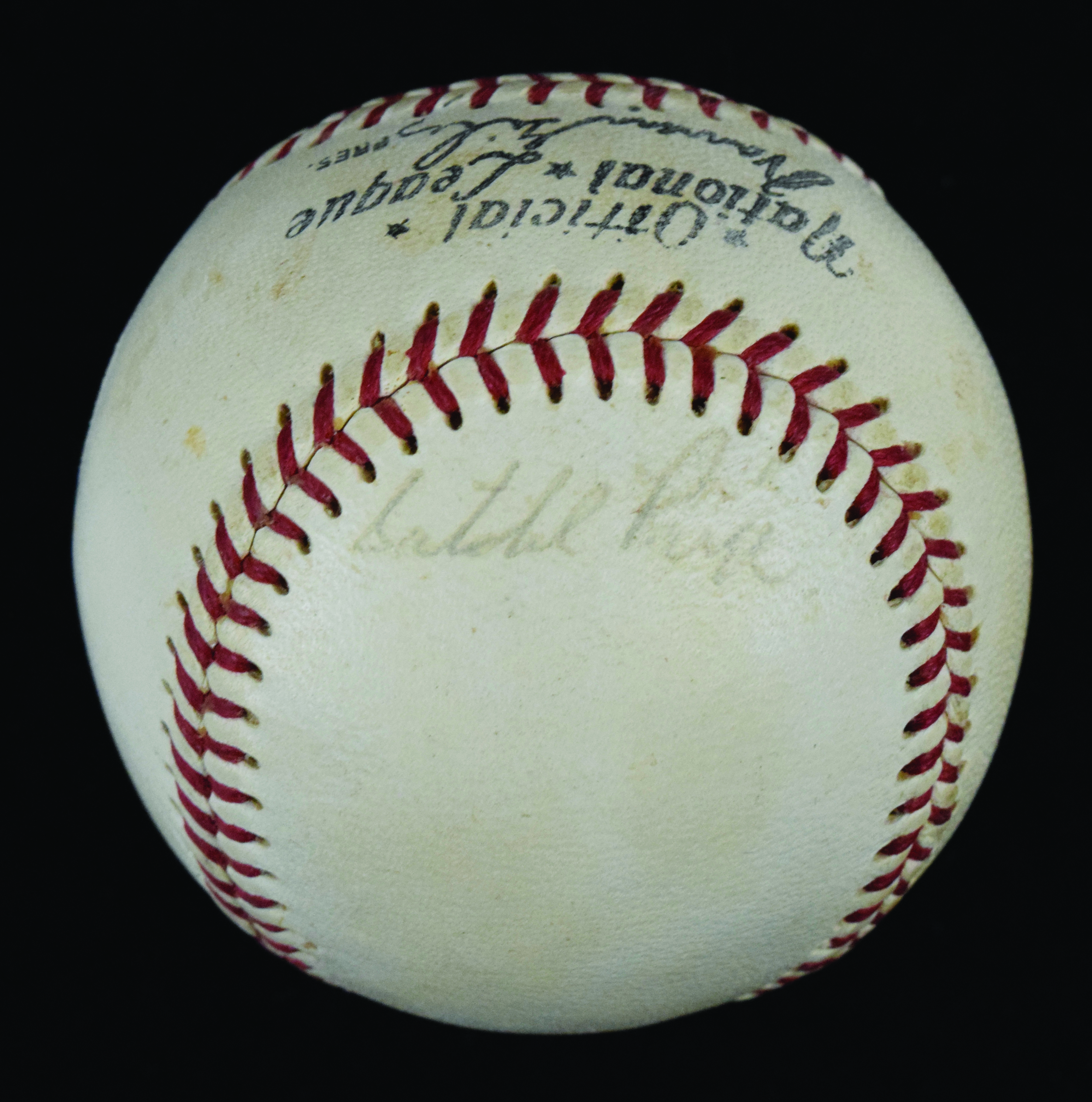 Description:Satchel Paige single-signed W.Giles NL baseball - JSA (EX). Paige signed the side panel in black ink. Signature rates 7 out of 10. Includes full LOA from JSA. Scattered areas of light to moderate toning: EX ($1,500-$3,000)