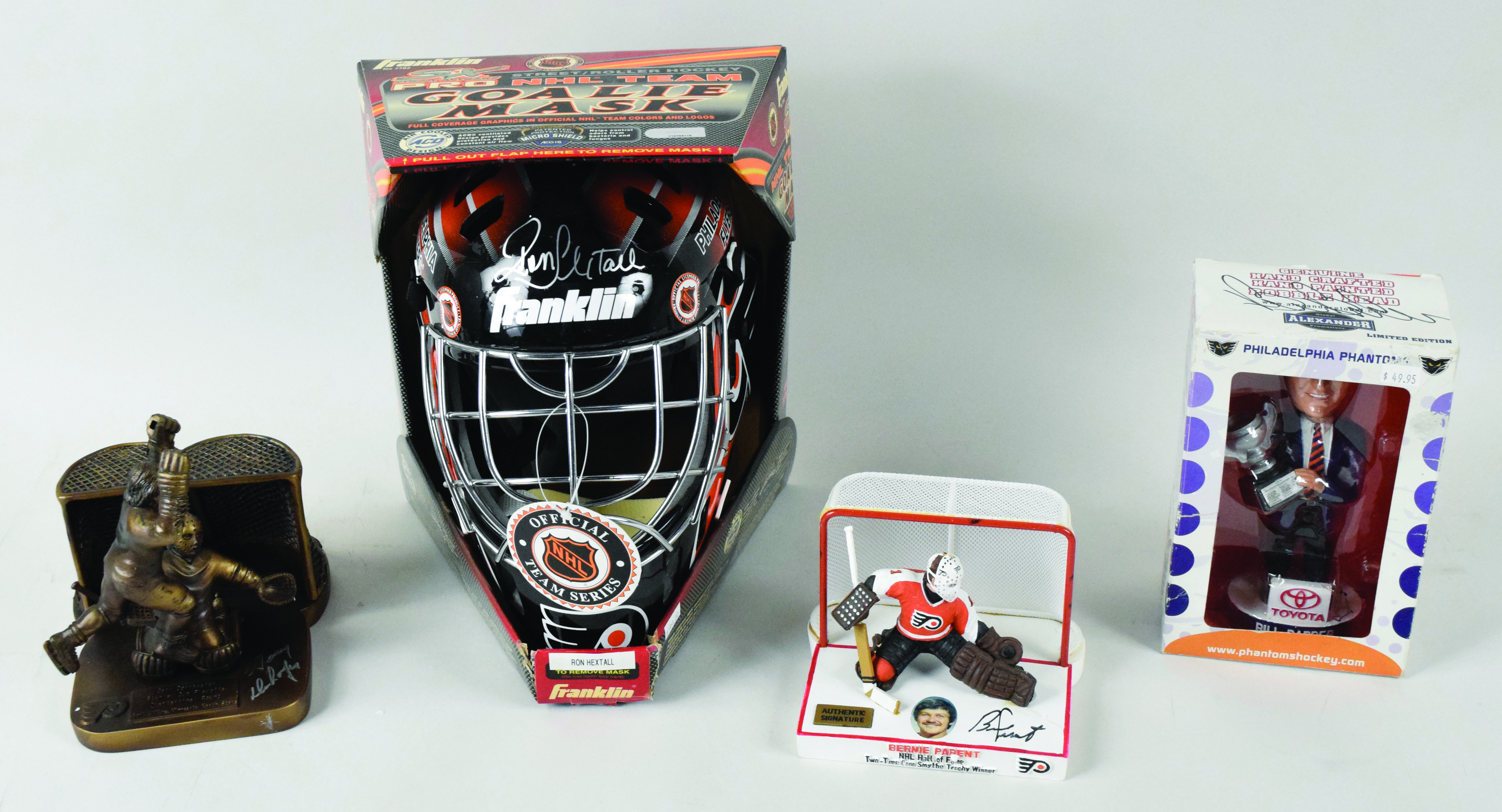 Description:Philadelphia Flyers stars and HOFers autograph lot (EX-NM/MT). Includes a Bernie Parent statue by Bobble Dreams signed by Parent (spots of glue residue likely from the production process), 2004-05 Philadelphia Phantoms SGA bobblehead signed on the statue and on the box by Bill Barber, Flyers goalie mask signed by Ron Hextall, and Gary Dornhoefer statue by Bobble Dobbles (season ticket holder holiday gift) signed by Dornhoefer (minor spot of wear on the front edge). Signatures rate 7/8 (Dornhoefer) to 9/10 out of 10: EX-NM/MT