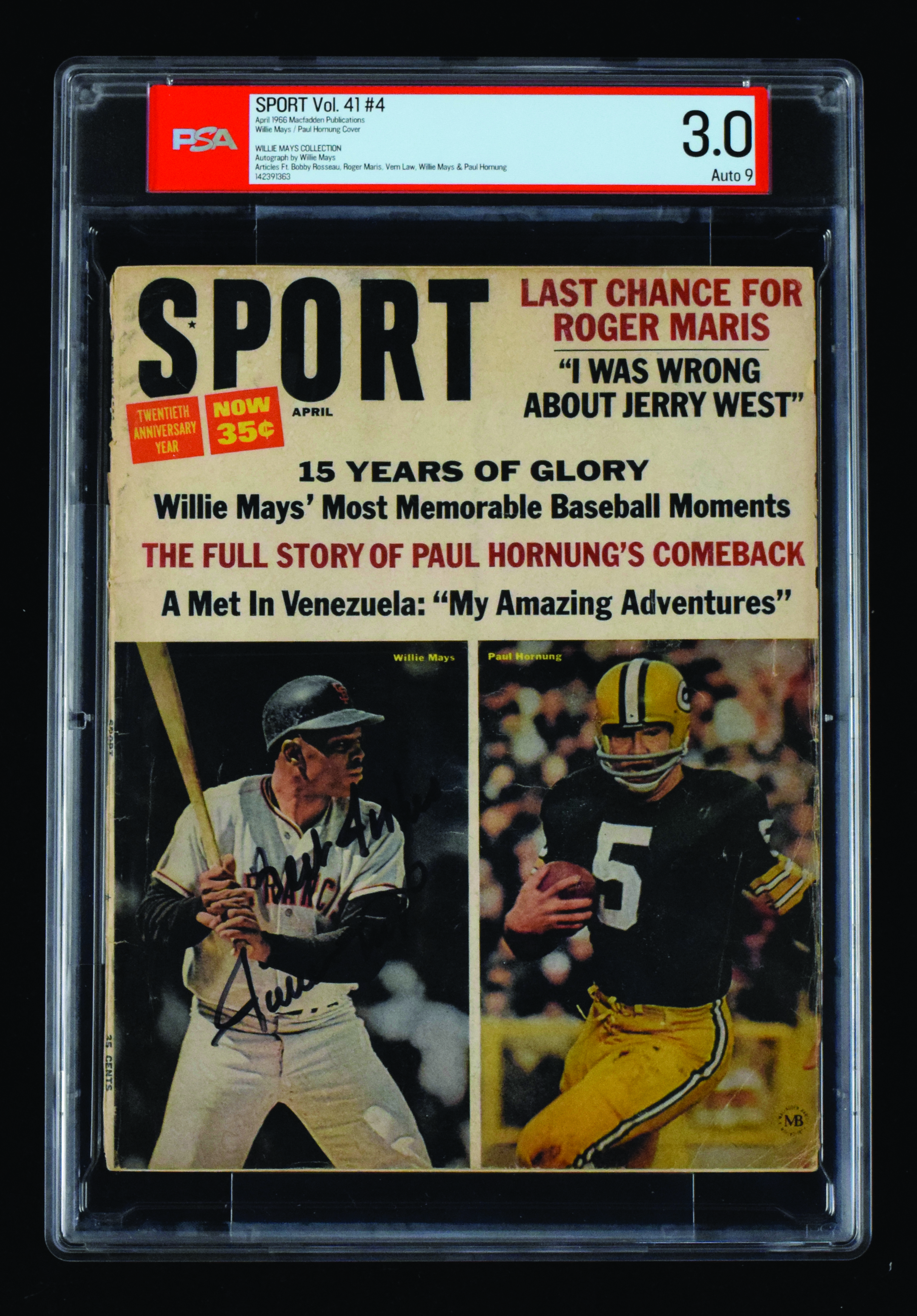 Description:Willie Mays autographed 1966 Sport Magazine (PSA 3.0 with 9 auto) April 1966 issue of Sport Magazine has been graded 3.0 by PSA with the autograph, done in black marker, graded "9." Encapsulated by PSA with "Willie Mays Collection" pedigree noted on the holder. This is one of very few signed magazines which was graded by PSA and noted in this manner: PSA 3.0 with 9 auto ($500-$750)