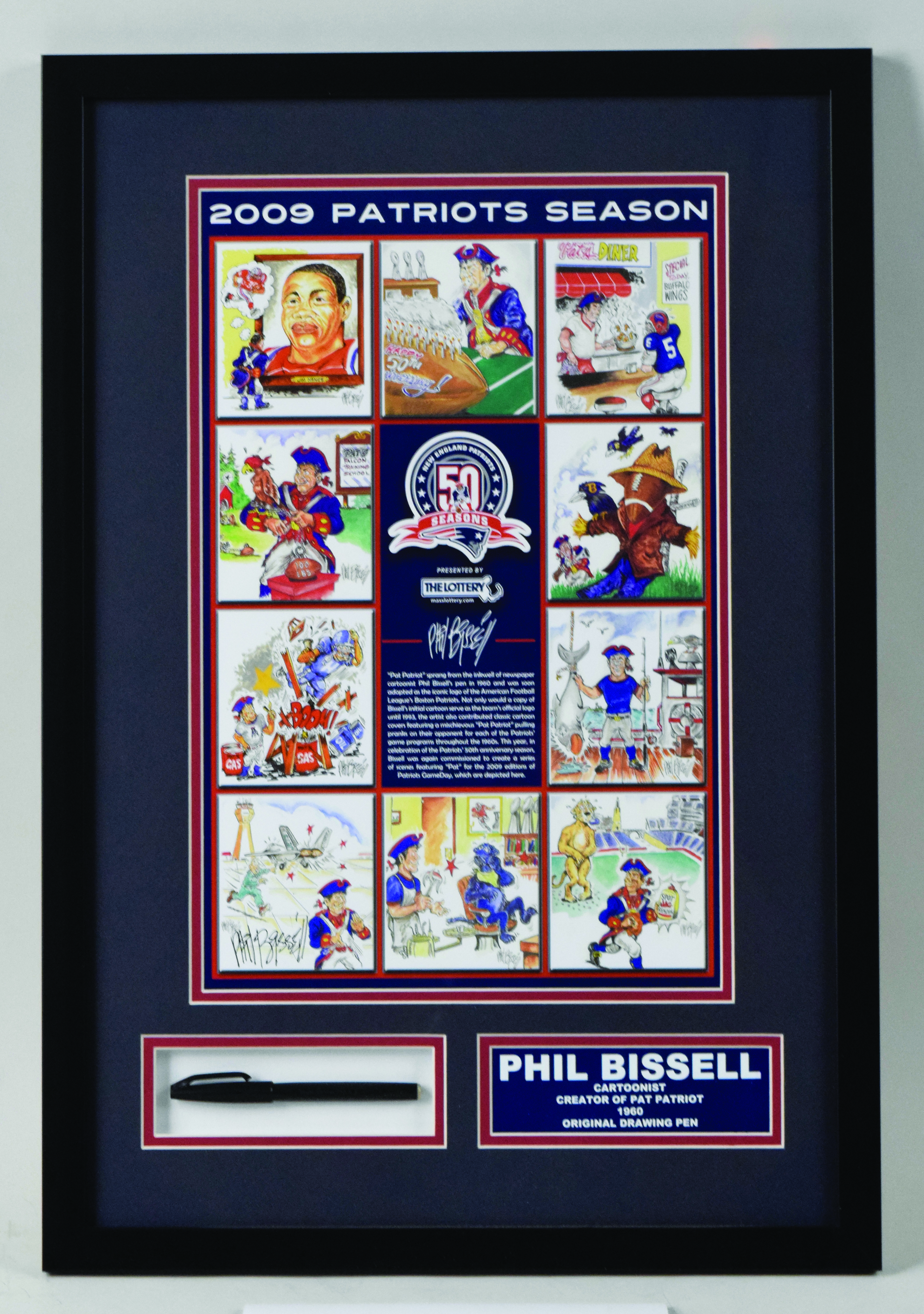 Description:Phil Bissell signed "Pat Patriot" framed display (NM). Approx. 17.5"x25.5" framed display containing 2009 New England Patriots "Pat Patriot" print signed by Bissell in black ink. Signature rates 9/10 out of 10. An original drawing pen is matted below the print. Due to framing, complete conditions are unknown: NM appearance