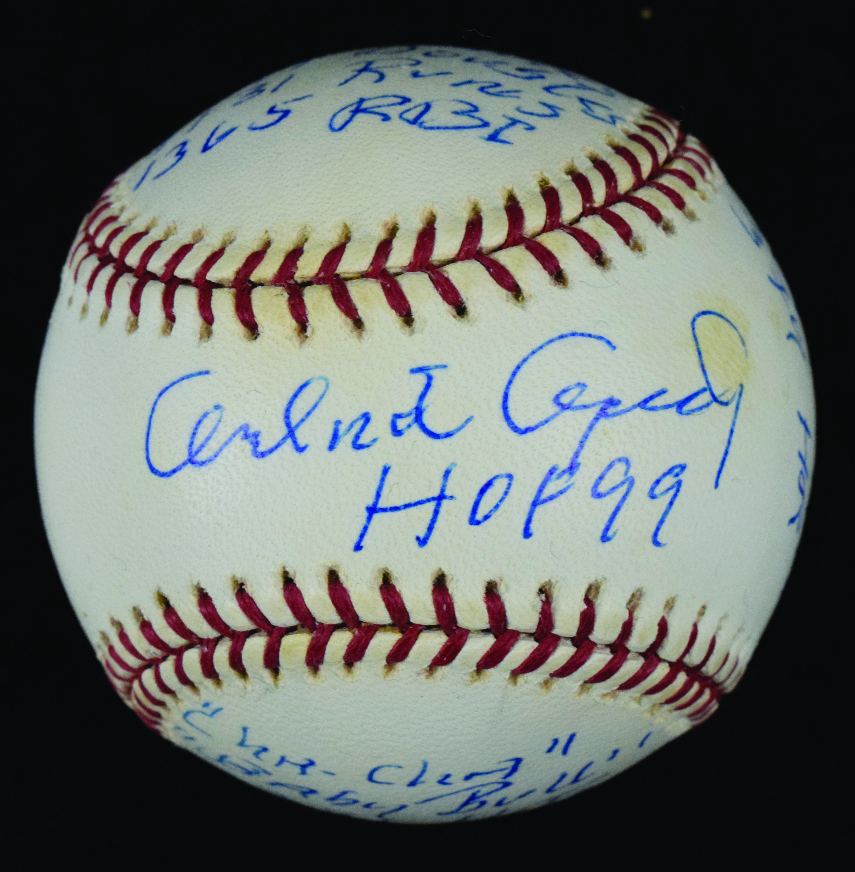 Description:Orlando Cepeda signed and multi-inscribed limited edition stat ball (EX/MT). B.Selig ML ball signed by Cepeda in blue ink with (16) inscriptions: "1958 NL ROY" "1967 NL MVP" "379 HR" "1966 Comeback Player of the Year" "7 All Star Games" "Cha-Cha" "Baby Bull" "2351 Hits" "142 SB" "297 Career Avg" "7927 At Bats" "2124 Games" "417 Doubles" "1131 Runs" "1365 RBI" "HOF 99". Signature rates 8/9 out of 10. Numbered 325/1000. Reggie Jackson serial #ed sticker is on the ball, and includes matching COA. Small areas of mostly minor toning: EX/MT