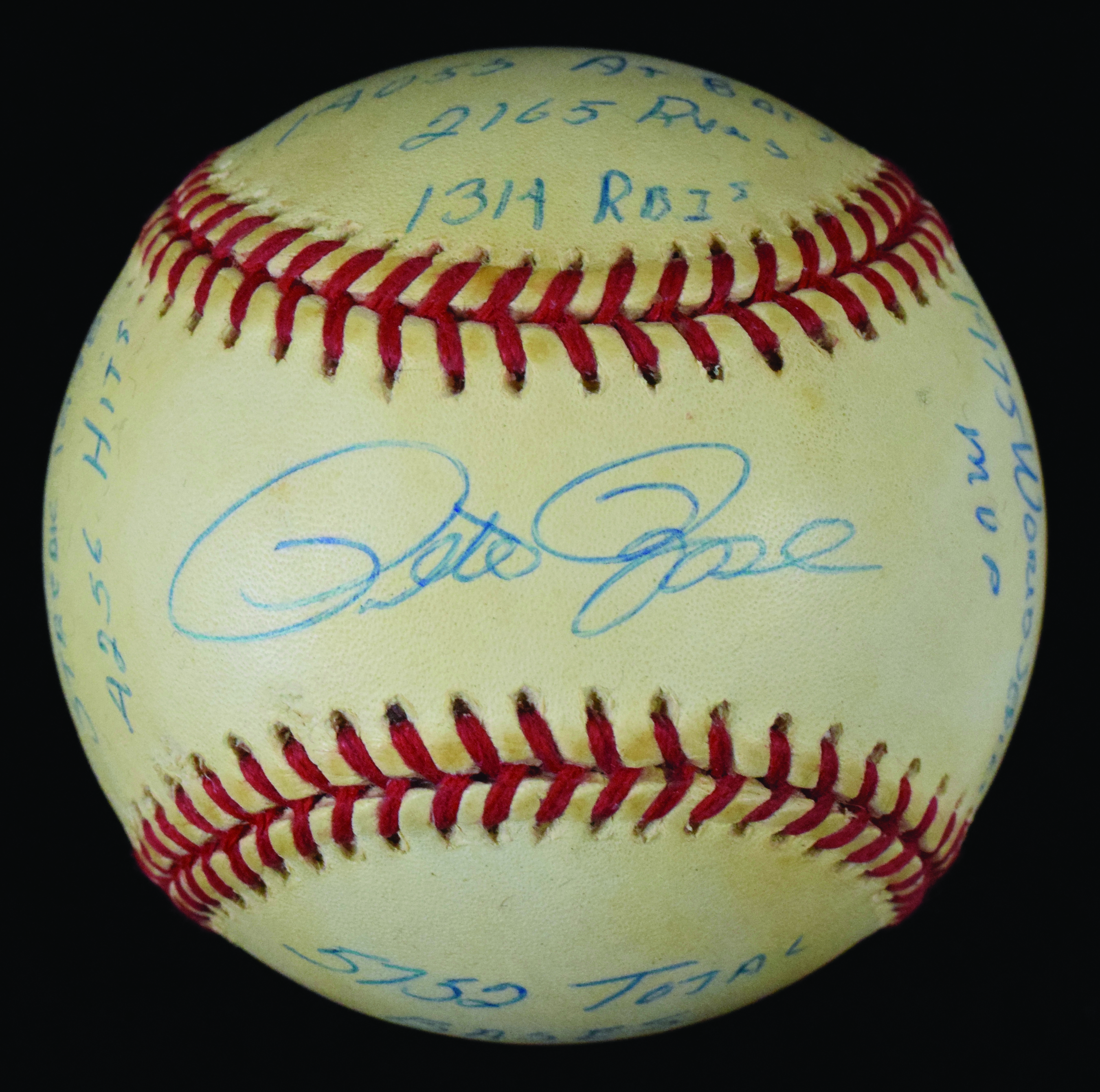 Description:Pete Rose signed and multi-inscribed limited edition stat ball (EX). B.Selig ML ball signed by Rose in blue ink with (15) inscriptions: "1963 NL ROY" "1973 NL MVP" "1975 World Series MVP" "17 All Star Games" "44 Game Hitting Streak 1978" "4256 Hits" "5752 Total Bases" "1972 Winning Games" "746 Doubles" "303 Career Avg" "3315 Singles" "3562 Games" "14,053 At Bats" "2165 Runs" "1314 RBIs". Signature rates 8 out of 10. Numbered 372/1000. Reggie Jackson serial #ed sticker is on the ball, and includes matching COA. Even toning on each panel: EX