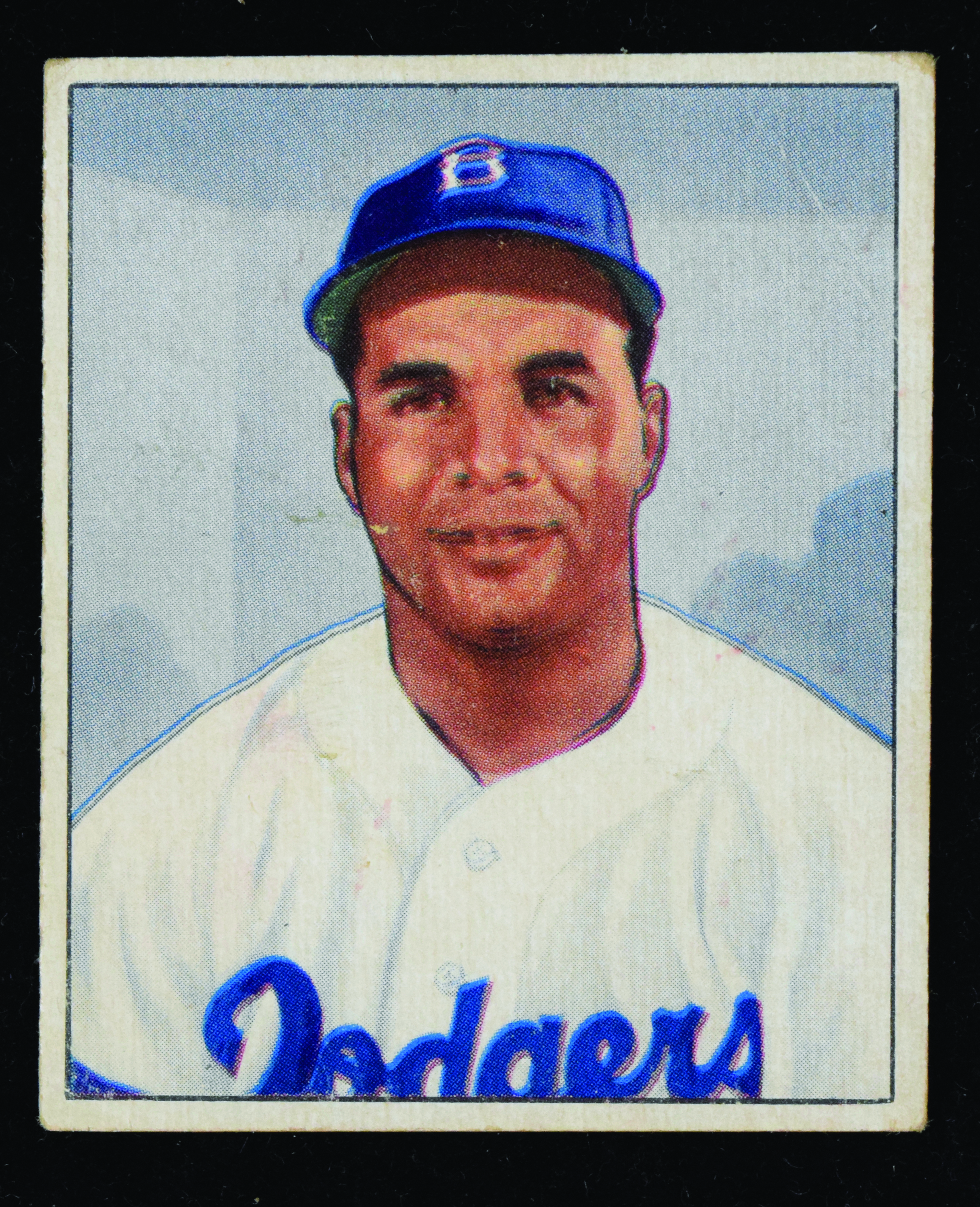 Description:1950 Bowman #75 Roy Campanella (VG-VG/EX). Fairly evenly centered, with wear mainly at the top corners, along with some minor surface wear. Very light hairline creasing near the top right corner, and focus of the image is slightly out of register: VG-VG/EX