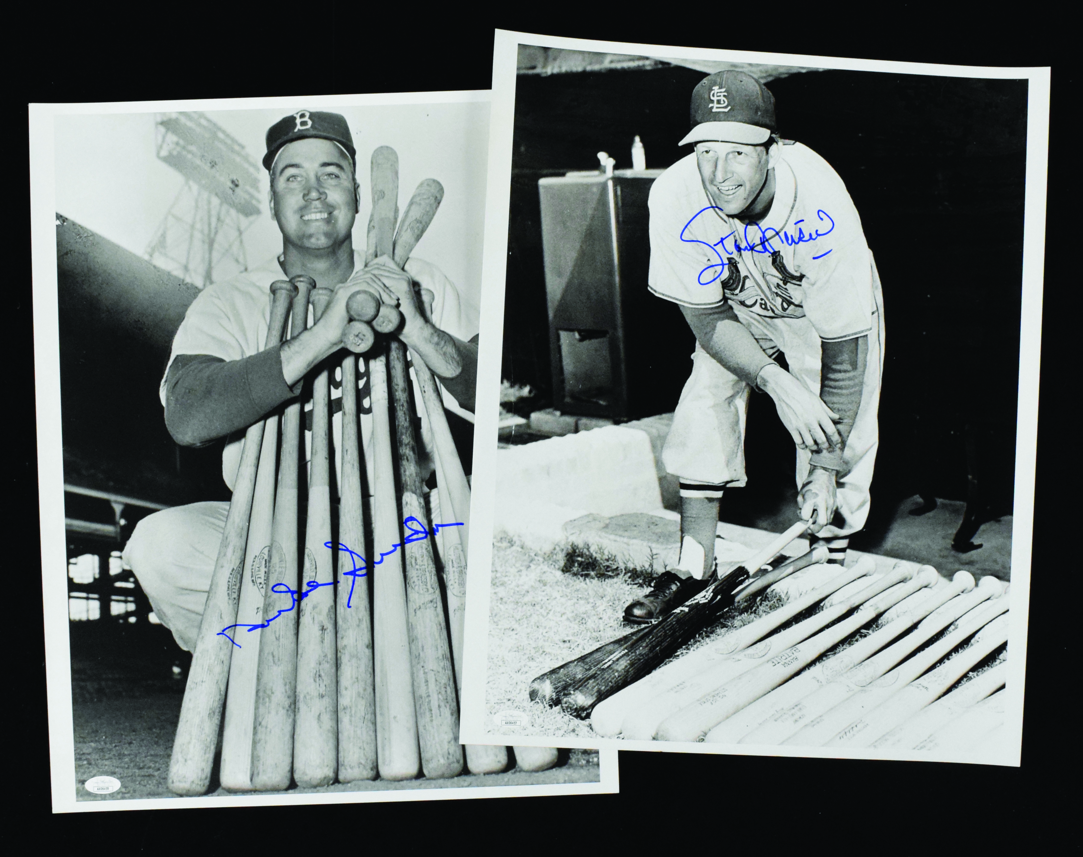 Description:Stan Musial and Duke Snider signed 16"x20" photographs - JSA (NM-NM/MT). Both are signed in blue marker. Signatures rate 9 to 10 out of 10. JSA serial #ed sticker is on each photo: NM-NM/MT