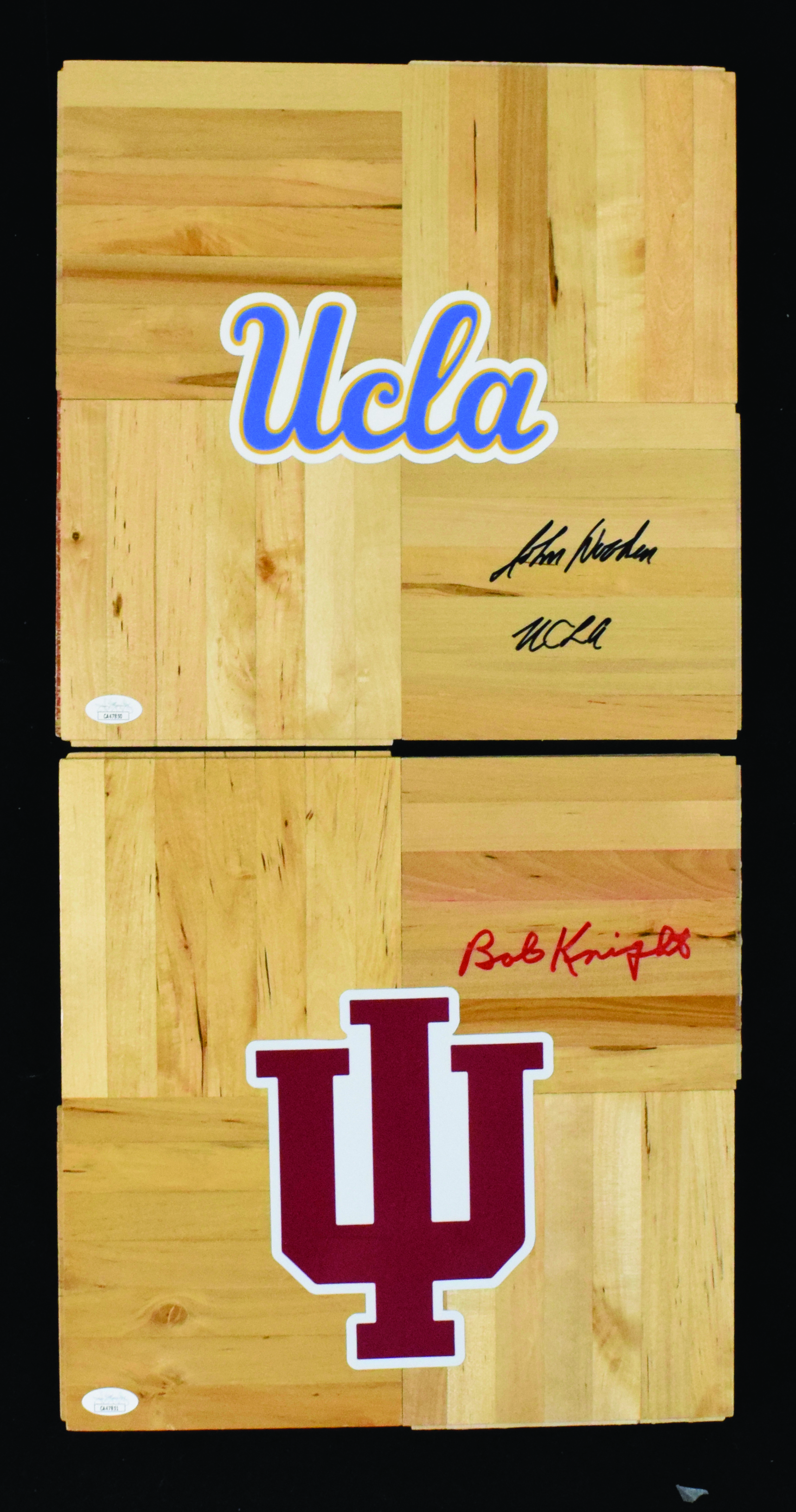 Description:John Wooden and Bob Knight signed floor boards - JSA (NM-NM/MT). Includes 12"x12" wooden UCLA logo panel signed by John Wooden with "UCLA" inscription, and 12"x12" wooden Indiana logo panel signed by Bob Knight. Signatures rate 9 to 10 out of 10. JSA serial #ed sticker is on both: NM-NM/MT