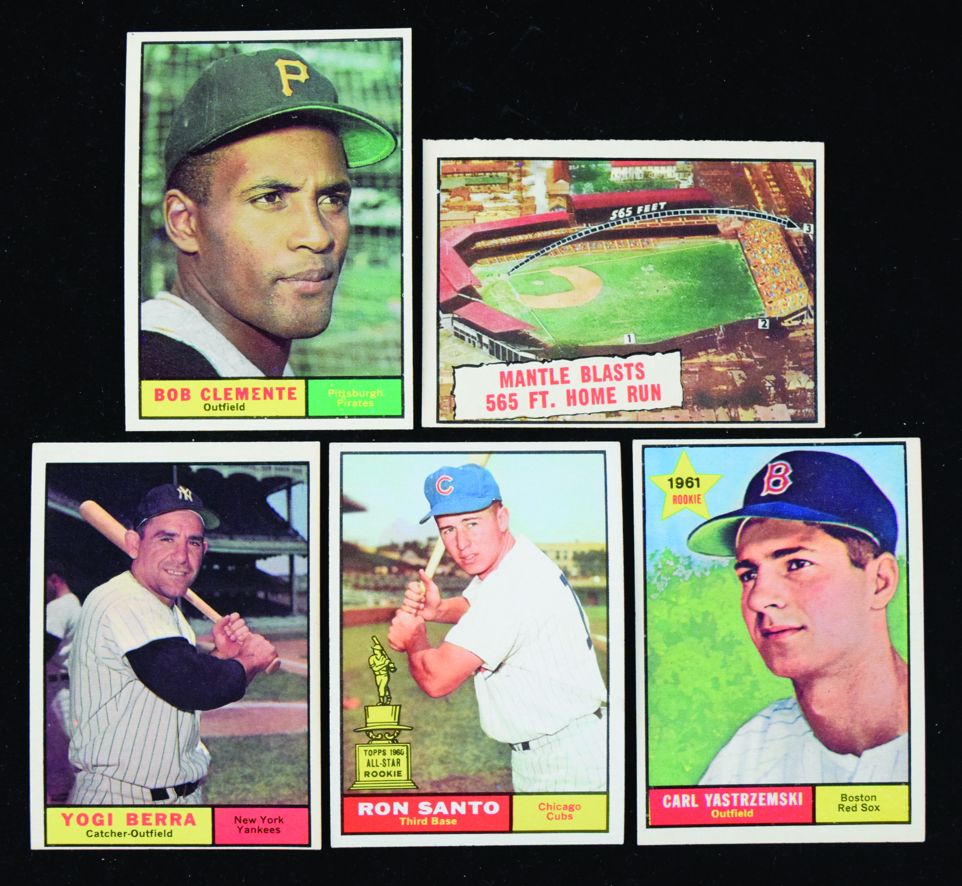 Description:Sharp lot of (5) 1961 Topps HOFers, including Clemente, Yaz and Mantle Thrills (EX-EX/MT). Very nice lot of stars from the 1961 Topps set includes #s 35 Ron Santo RC (EX/MT), 388 Roberto Clemente (EX/MT), 287 Carl Yastrzemski (EX OC; miscut on reverse), 406 Mickey Mantle Thrills (EX/MT OC) and 425 Yogi Berra (EX/MT OC). Range: EX-EX/MT.