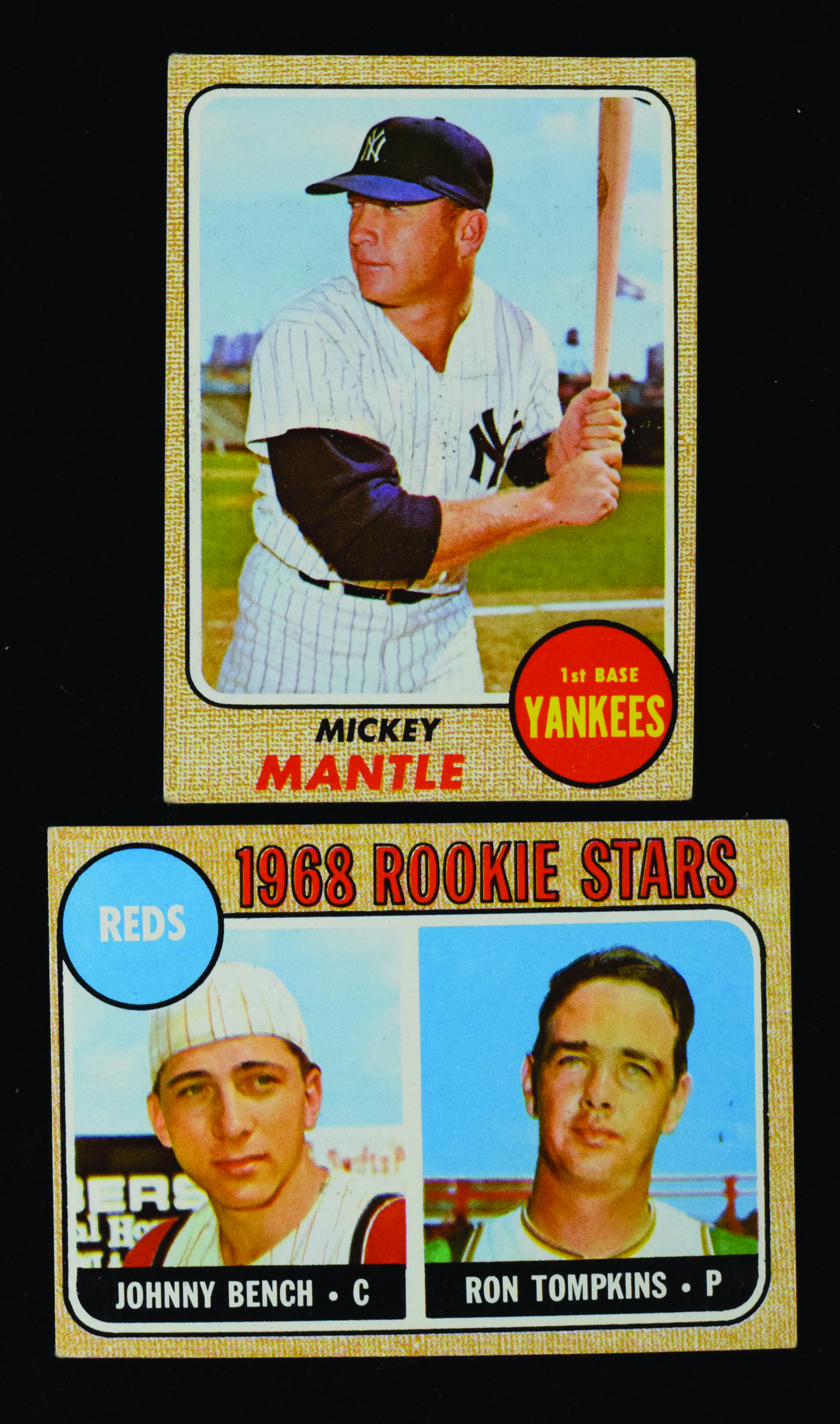 Description:Lot of (2) 1968 Topps key cards, with Johnny Bench RC and Mickey Mantle (VG-VG/EX OC). High-value lot of key cards from the 1968 Topps set, with #247 Johnny Bench RC (VG/EX OC) and #280 Mickey Mantle (VG). Backs of both are clean. Range: VG-VG/EX OC.