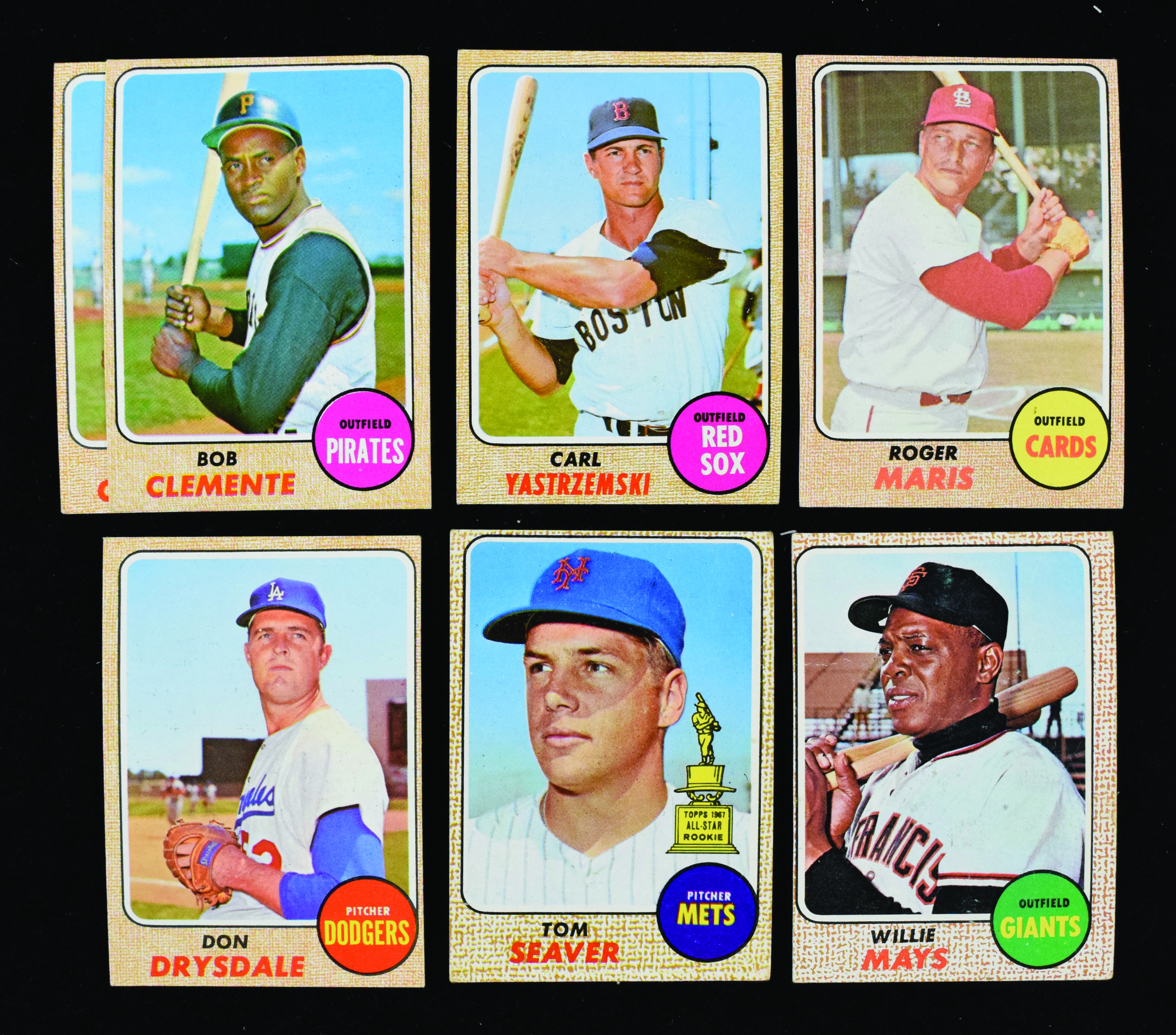 Description:Lot of (10) 1968 Topps stars and HOFers, with (2) Clemente, Mays and Maris (PR-EX). Assortment of key cards from the 1968 Topps set includes #s (2) 250 Carl Yastrzemski (both EX), 330 Roger Maris (VG/EX OC), (2) 150 Roberto Clemente (VG/EX & EX), 145 Don Drysdale (VG/EX OC), 240 Al Kaline (EX), 220 Harmon Killebrew (FR), 50 Willie Mays (PR) and 45 Tom Seaver (VG/EX OC). Range: PR-EX.
