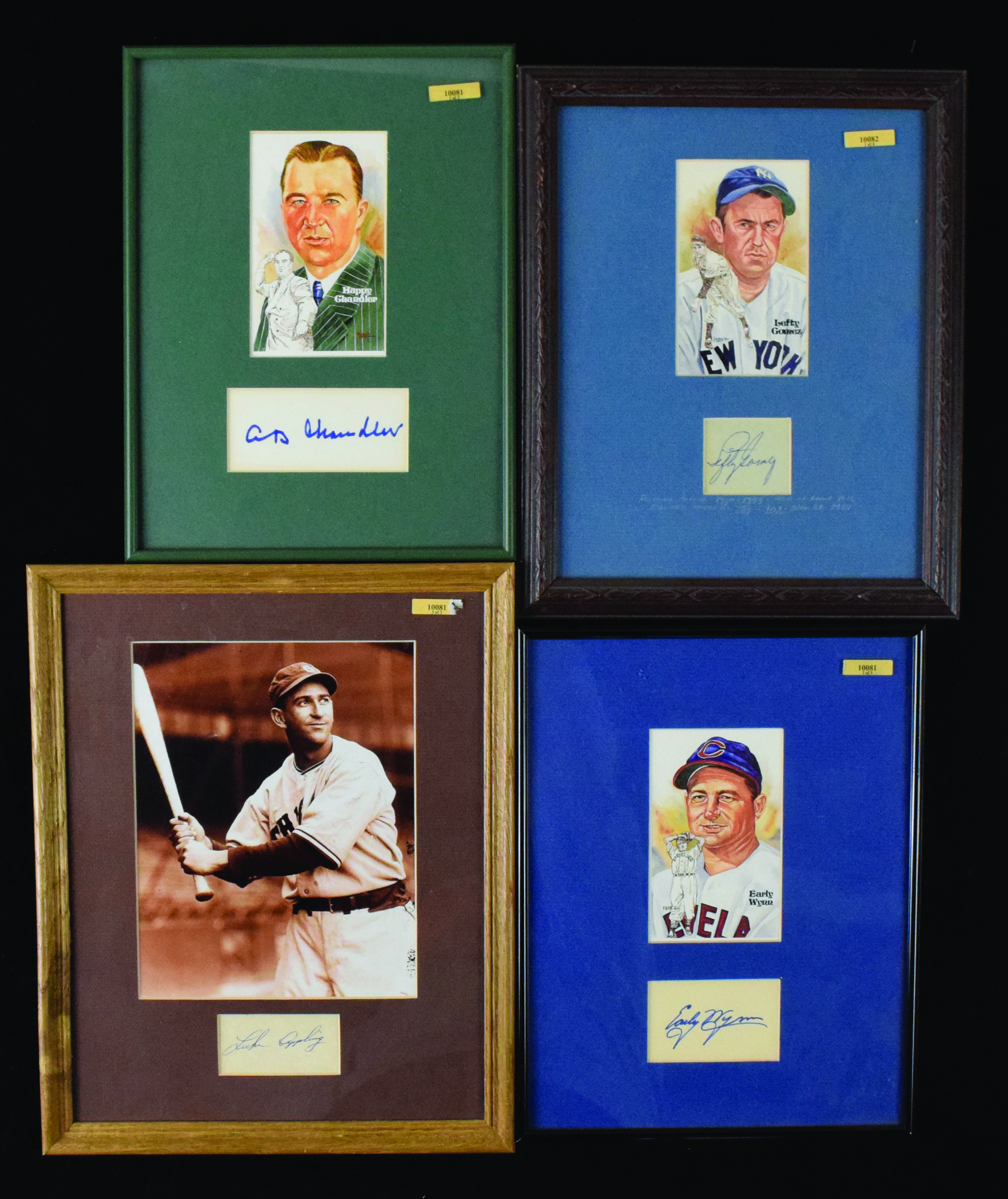 Description:Lot of (4) HOFer framed cut signature displays, with Appling, Wynn, Chandler and Gomez (Sigs. MT). Each is framed and matted to 12"x15" or slightly smaller, with a cut signature displayed in the matting. Includes (1) Early Wynn with Perez-Steele postcard; (1) Luke Appling with 8"x10" photo; (1) A.B. Chandler with Perez-Steele postcard; and (1) Lefty Gomez with Perez-Steele postcard. Signatures rate 9/10 out of 10, and displays appear EX/MT-NM.