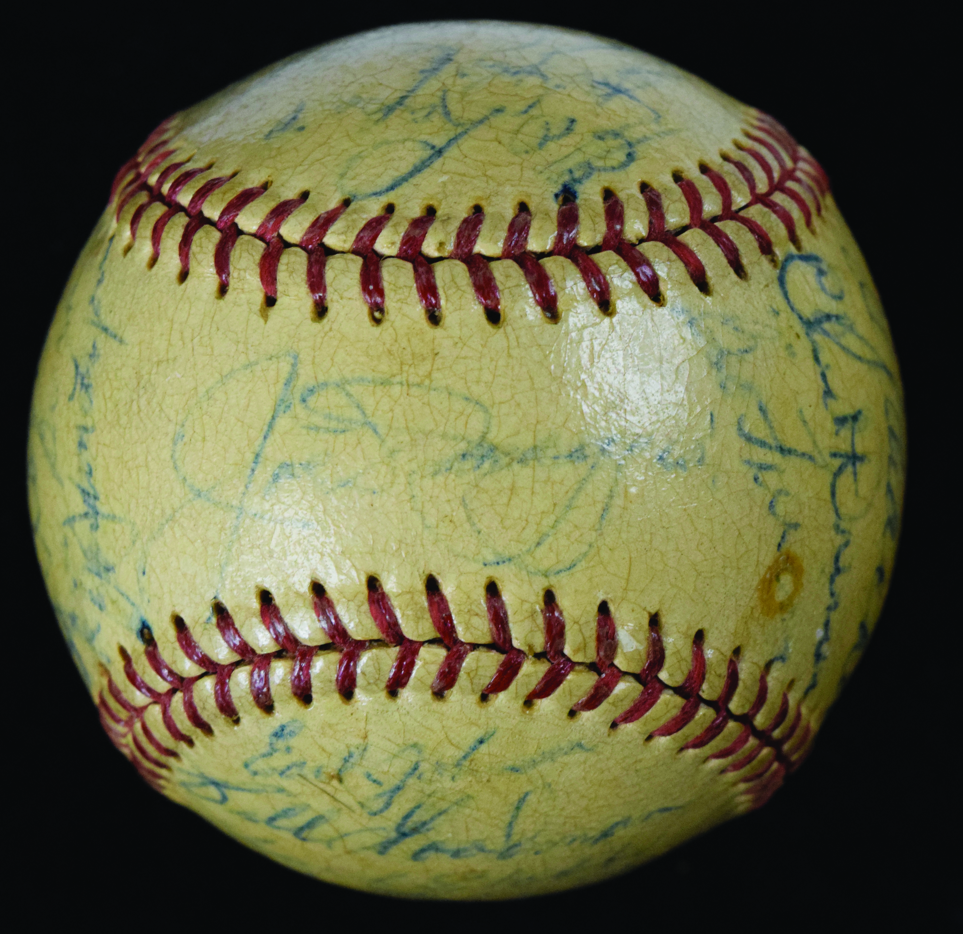 Description:C. 1950s multi-signed baseball with (24) sigs., including Joe DiMaggio & Ted Williams (Sigs. GD-EX/MT). Reach baseball with faded stampings has been signed by (25) 1951 A.L. All-Stars and others, including Joe DiMaggio on the sweet spot, with additional side panel signatures from Ted Williams, Phil Rizzuto, Bob Lemon, Ed Lopat, Chuck Dressen, Billy Goodman, Earl Johnson, Chuck Stobbs, Johnny Lindell and others. Ink signatures range from 2 to 6 (avg/ 4/5) out of 10. Ball is heavily toned with faded stampings: VG.