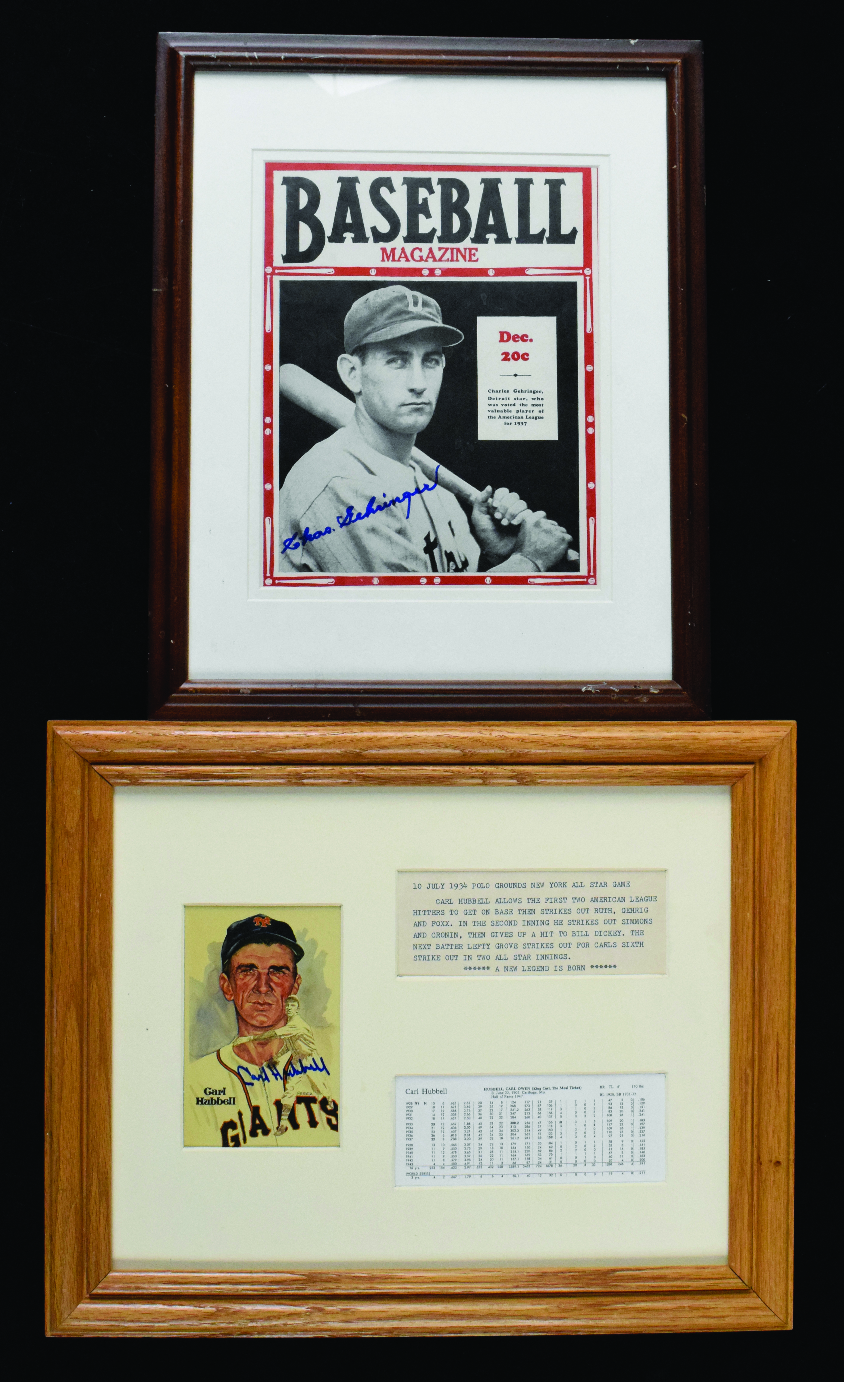 Description:Lot of (2) framed and autographed display pieces, with Charlie Gehringer and Carl Hubbell (Sigs. MT). Lot includes (1) Carl Hubbell Perez-Steele postcard signed by Hubbell and framed to approx. 14"x16" and (1) Baseball Magazine print signed by Charlie Gehringer, framed to approx. 12"x16." Signatures rate 9 out of 10, and frames have light to moderate wear: EX-NM.
