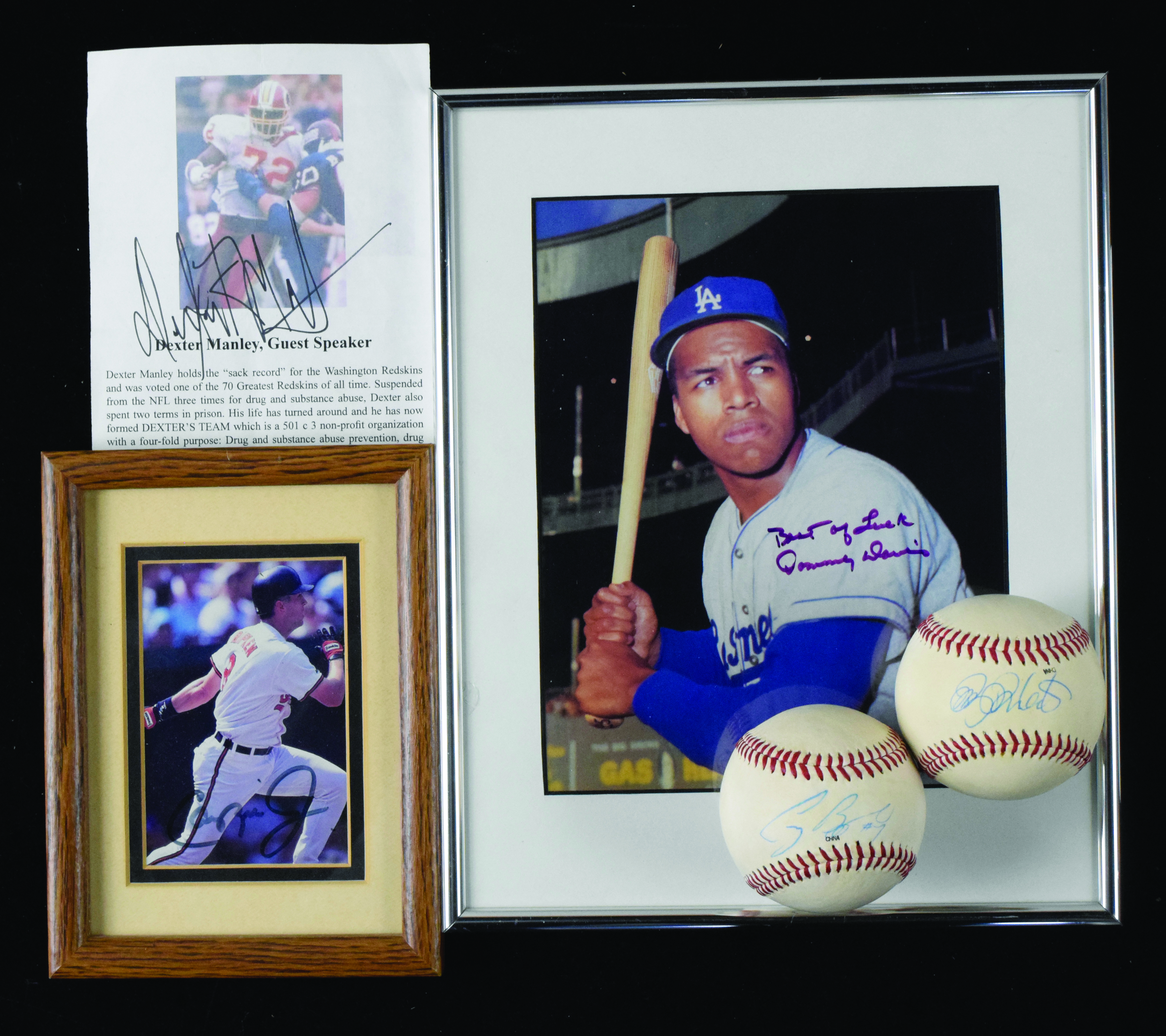 Description:Small group of autographed memorabilia, including Cal Ripken Jr., Dexter Manley (Sigs. EX/MT-MT). Lot of assorted autographs includes (6) baseballs, with (3) signed by Doug Drabek, (1) signed by Craig Biggio and (2) unidentified. Also includes (1) small framed photo signed by Cal Ripken Jr., (1) 8"x10" framed photo signed by Tommy Davis; (1) flyer signed by Dexter Manley; (1) 8"x10" photo signed by Dean Stone and (1) matted photo signed by West Parker. Signatures range from 6 to 9 (avg. 8) out of 10, and items range VG/EX-NM.