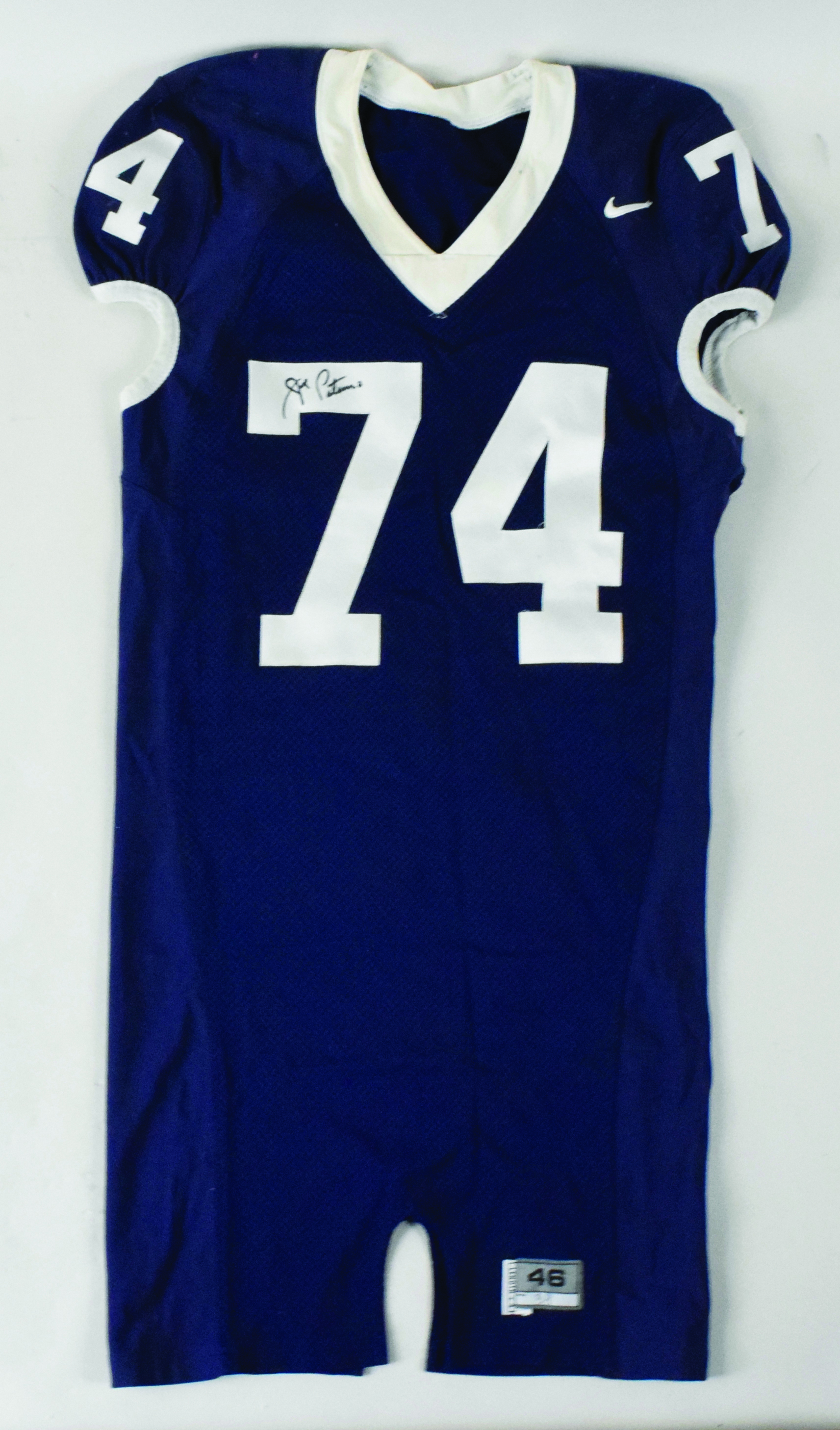 Description:Joe Paterno autographed collegiate model Penn State jersey with excellent use (Jersey: EX; Sig. MT). Penn State #74 jersey with size 46 "Length +4" tag on the tail with "38" written in marker displays excellent use and team repairs, mostly in the shoulder area. Legendary head coach Joe Paterno signed in black marker, rating 9 out of 10. Jersey: EX.