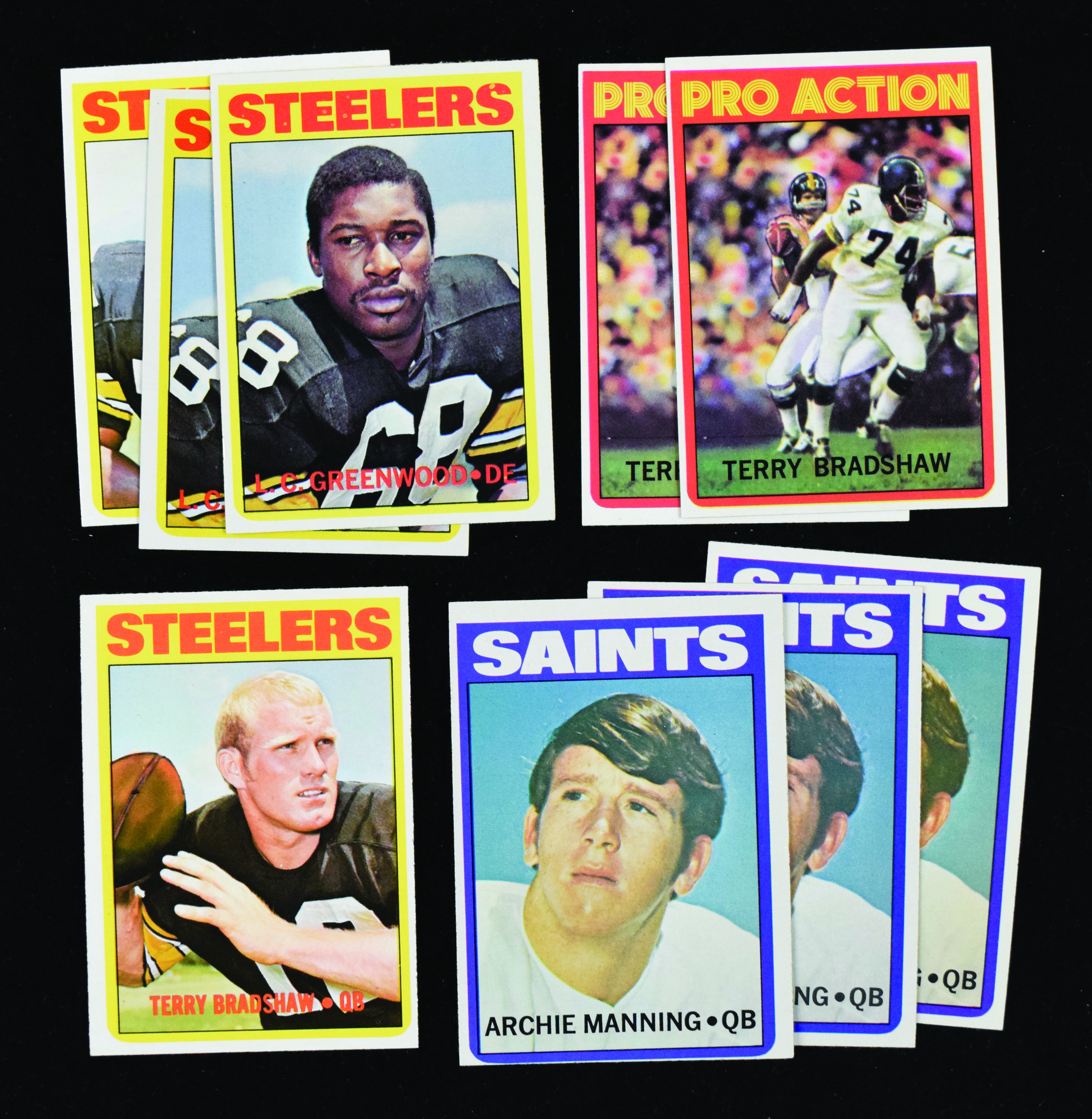 Description:Sharp lot of (9) 1972 Topps FB stars and RCs, including Bradshaw and Manning RC (EX/MT-NM OC). Cards are crisp with sharp corners, though most are off-center. Includes #s 150 Terry Bradshaw, (2) 120 Terry Bradshaw IA, (2) 101 L.C. Greenwood RC, 230 Joe Greene and (3) #55 Archie Manning RC. Range: EX/MT-NM OC.